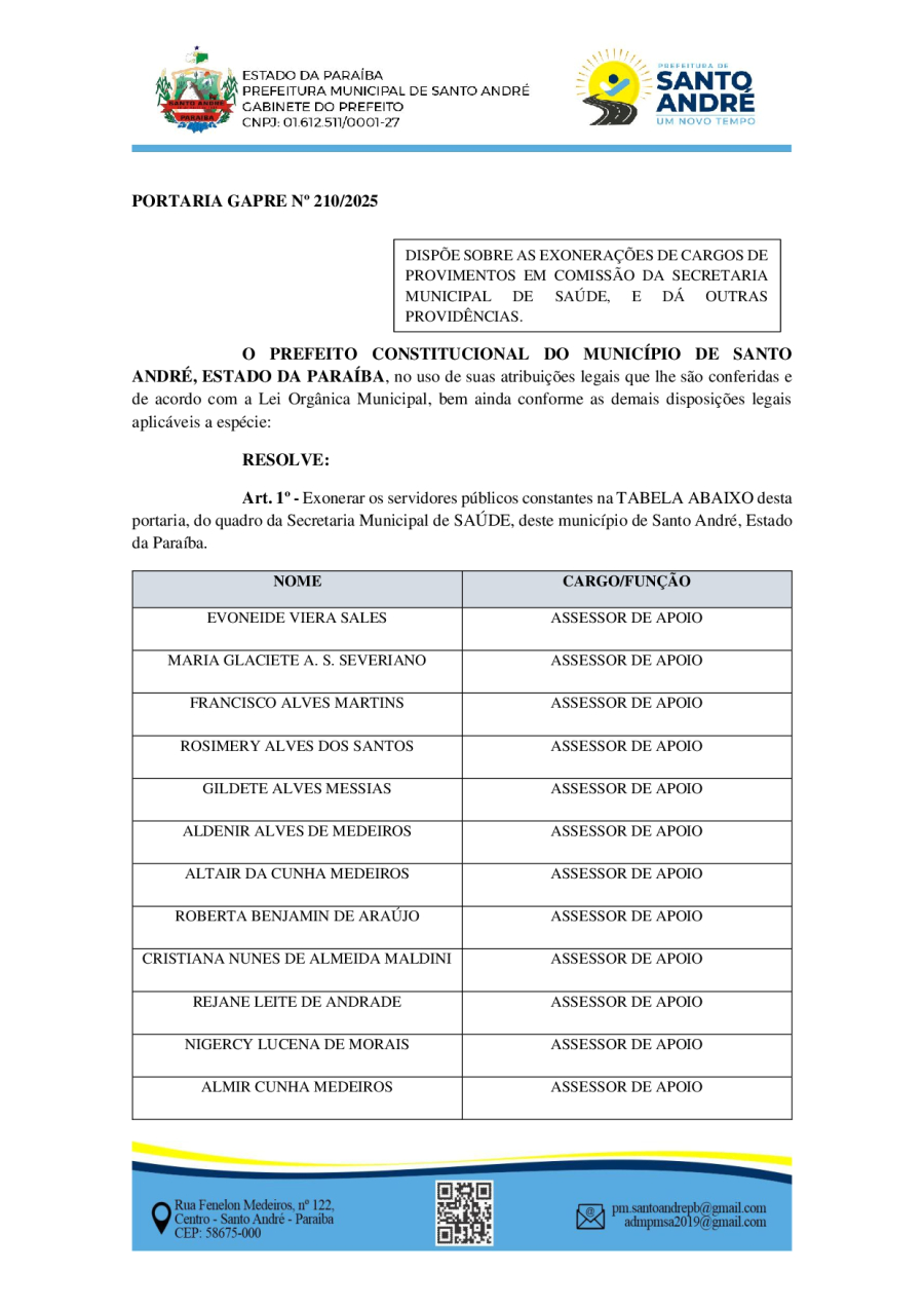 PORTARIA GAPRE Nº 210/2025 - DISPÕE SOBRE AS EXONERAÇÕES DE CARGOS DE PROVIMENTOS EM COMISSÃO DA SECRETARIA MUNICIPAL DE SAÚDE, E DÁ OUTRAS PROVIDÊNCIAS