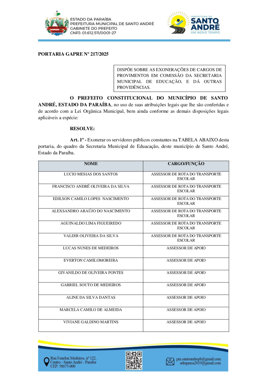 PORTARIA GAPRE Nº 217/2025 - DISPÕE SOBRE AS EXONERAÇÕES DE CARGOS DE PROVIMENTOS EM COMISSÃO DA SECRETARIA MUNICIPAL DE EDUCAÇÃO, E DÁ OUTRAS PROVIDÊNCIAS.