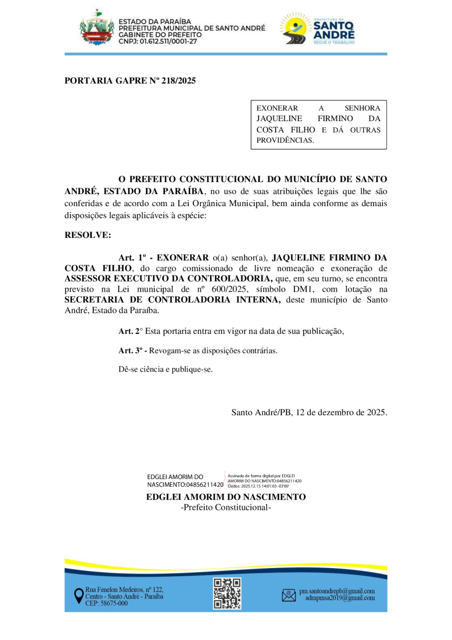 PORTARIA GAPRE Nº 218/2025 - EXONERAR A SENHORA JAQUELINE FIRMINO DA COSTA FILHO E DÁ OUTRAS PROVIDÊNCIAS.