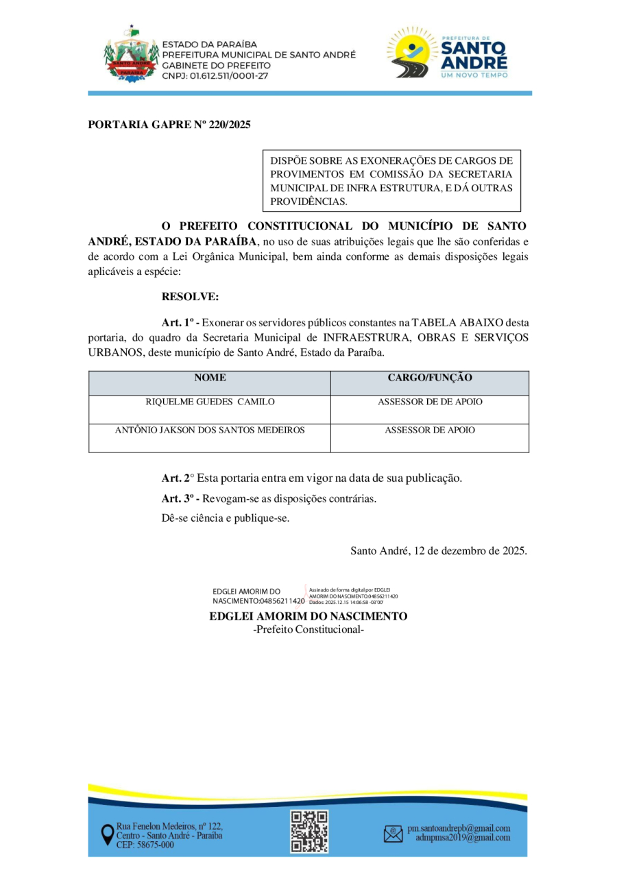 PORTARIA GAPRE Nº 220/2025 - DISPÕE SOBRE AS EXONERAÇÕES DE CARGOS DE PROVIMENTOS EM COMISSÃO DA SECRETARIA MUNICIPAL DE INFRA ESTRUTURA, E DÁ OUTRAS PROVIDÊNCIAS