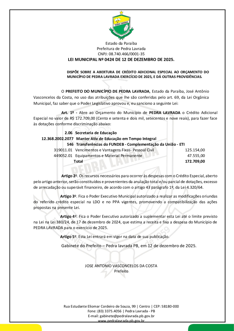 LEI N° 0424/2025 - DISPÕE SOBRE A ABERTURA DE CRÉDITO ADICIONAL ESPECIAL AO ORÇAMENTO DO MUNICÍPIO DE PEDRA LAVRADA EXERCÍCIO DE 2025
