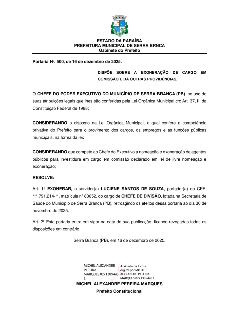PORTARIA N° 0500/2025 - EXONERAÇÃO DE LUCIENE SANTOS DE SOUZA
