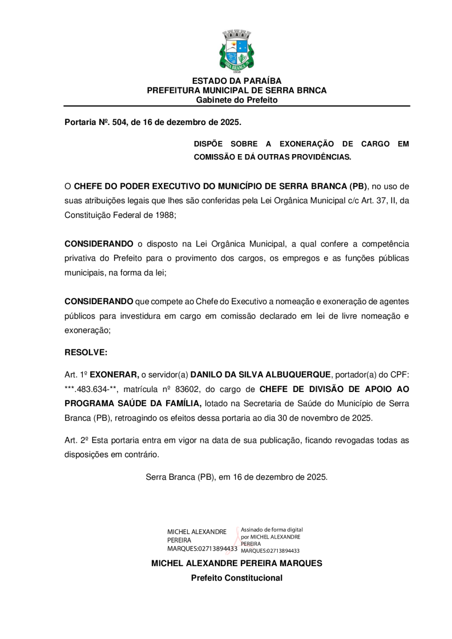 PORTARIA N° 0504/2025 - EXONERAÇÃO DE DANILO DA SILVA ALBUQUERQUE