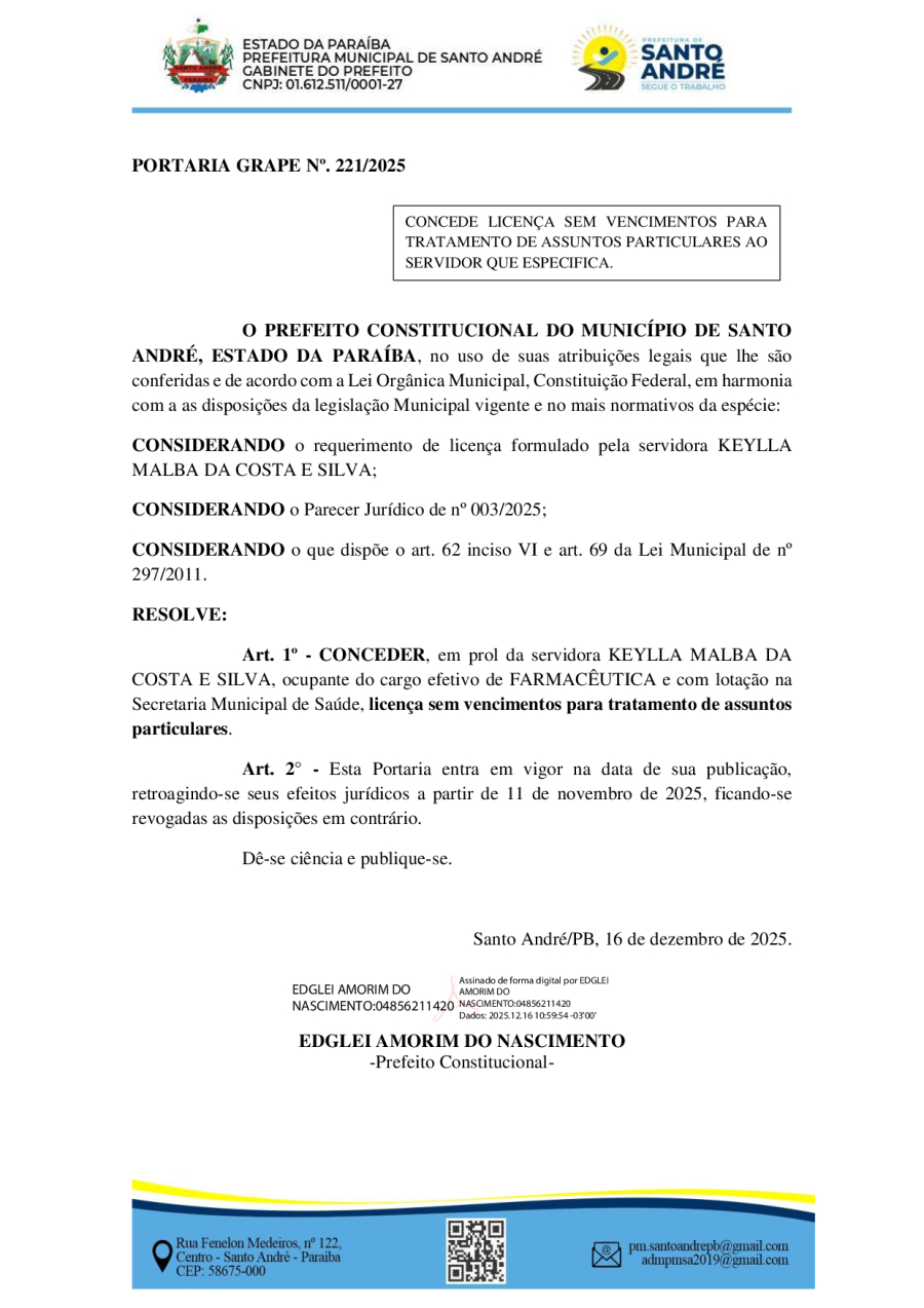 PORTARIA GRAPE Nº. 221/2025 - CONCEDE LICENÇA SEM VENCIMENTOS PARA TRATAMENTO DE ASSUNTOS PARTICULARES AO SERVIDOR QUE ESPECIFICA.