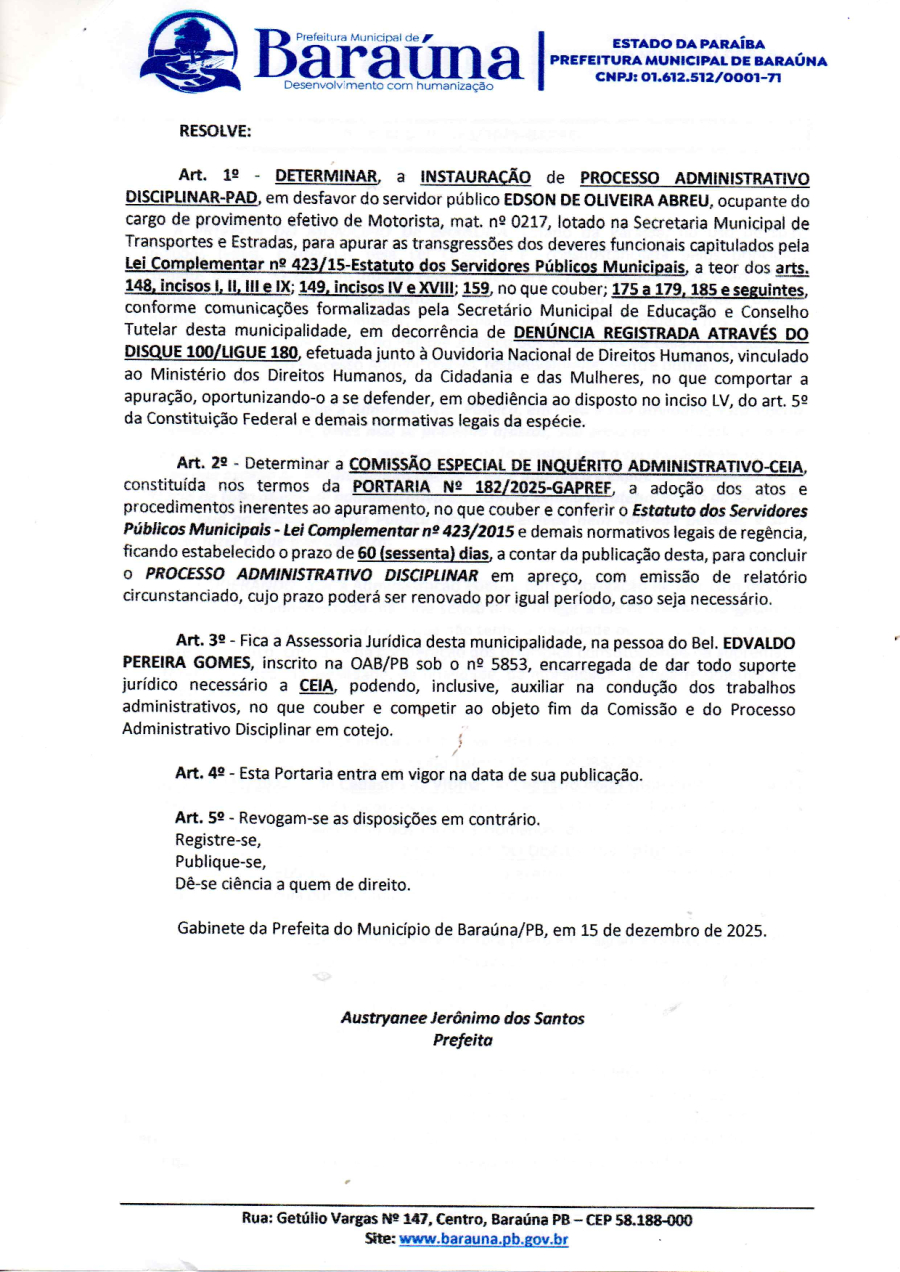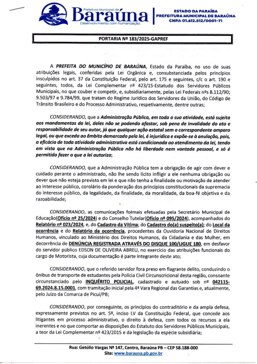 PORTARIA Nº 183/2025-GAPREF - DETERMINAR A INSTAURAÇÃO DE PROCESSO ADMINISTRATIVO DISCIPLINAR-PAD. - 16 DE DEZEMBRO DE 2025.