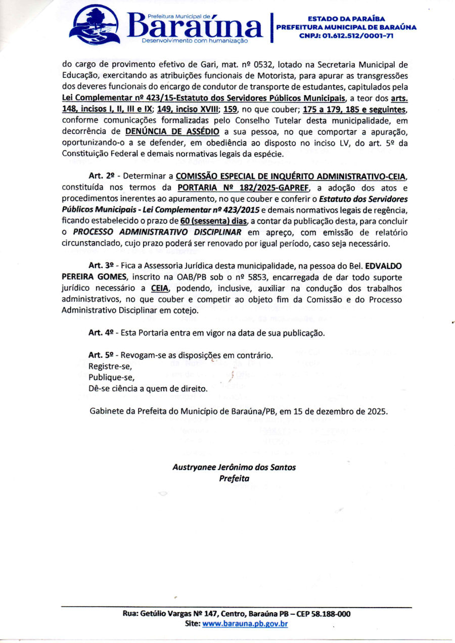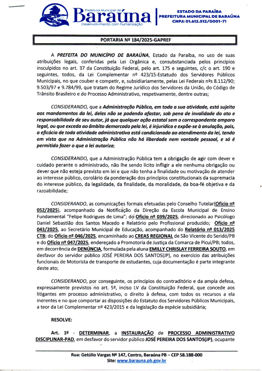 PORTARIA Nº 184/2025-GAPREF - DETERMINAR A INSTAURAÇÃO DE PROCESSO ADMINISTRATIVO DISCIPLINAR-PAD. - 16 DE DEZEMBRO DE 2025.