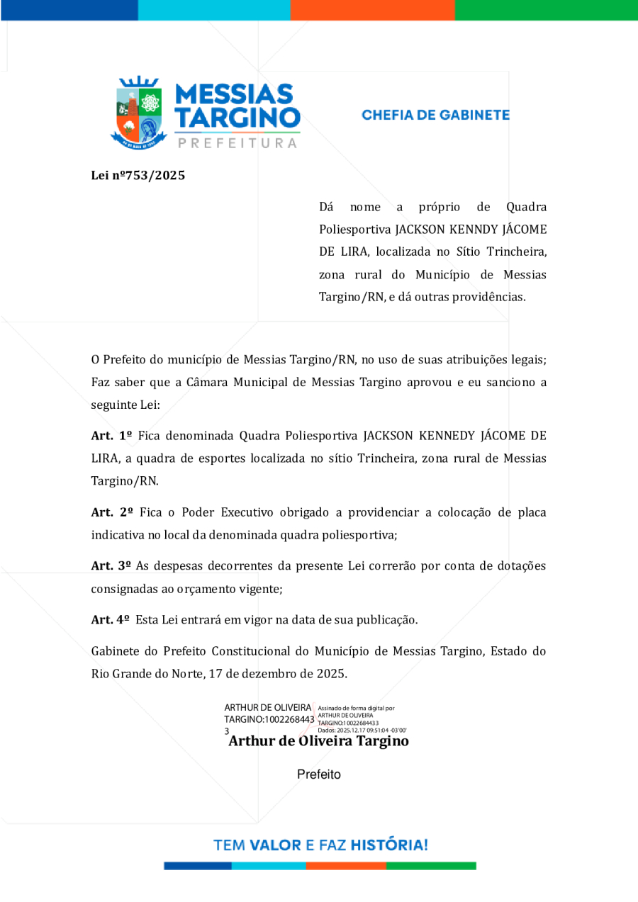 Conforme MP n° 2.200-2 de 24/08/2001, que institui a infraestrutura de chaves Públicas. Matéria Publicada no Diário Oficial do Município de Messias Targino/RN no dia - Edição 01437.