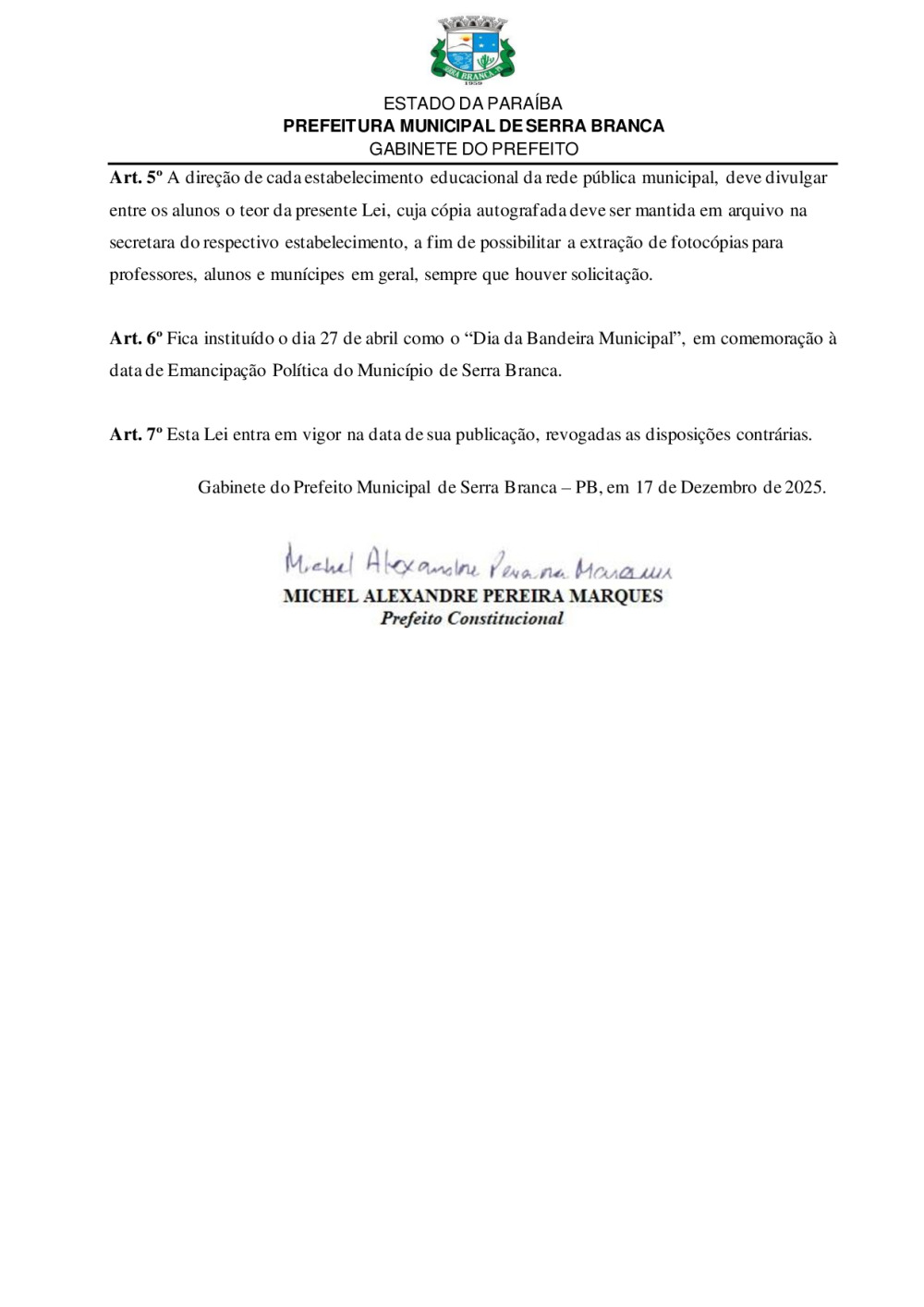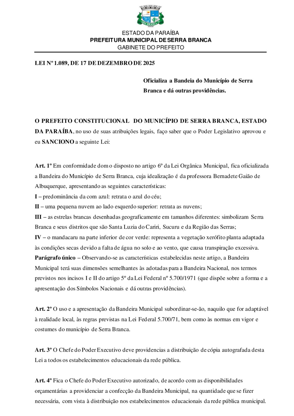 LEI N° 1089/2025 - OFICIALIZA A BANDEIRA DO MUNICÍPIO DE SERRA BRANCA