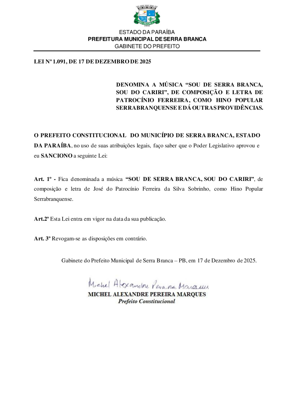 LEI N° 1091/2025 - DENOMINA A MÚSICA “SOU DE SERRA BRANCA, SOU DO CARIRI”, DE COMPOSIÇÃO E LETRA DE PATROCÍNIO FERREIRA, COMO HINO POPULAR SERRABRANQUENSE
