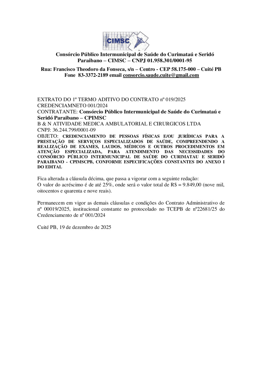 EXTRATO DO 1º TERMO ADITIVO DO CONTRATO N° 0019/2025 - CREDENCIAMNETO 0001/2024