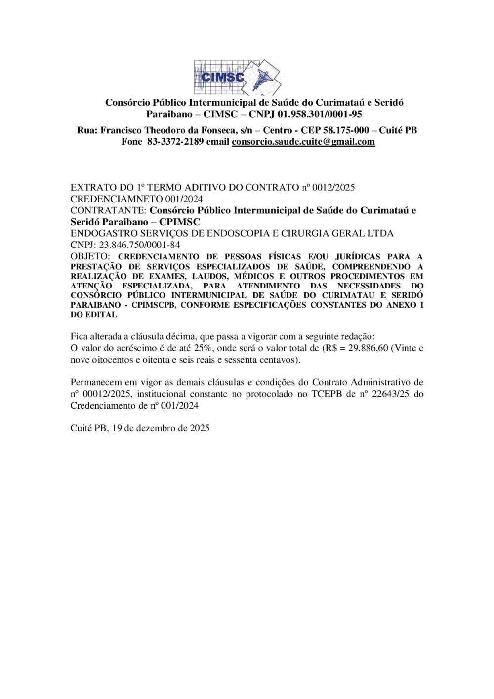 EXTRATO DO 1º TERMO ADITIVO DO CONTRATO N° 00012/2025 - CREDENCIAMNETO 0001/2024