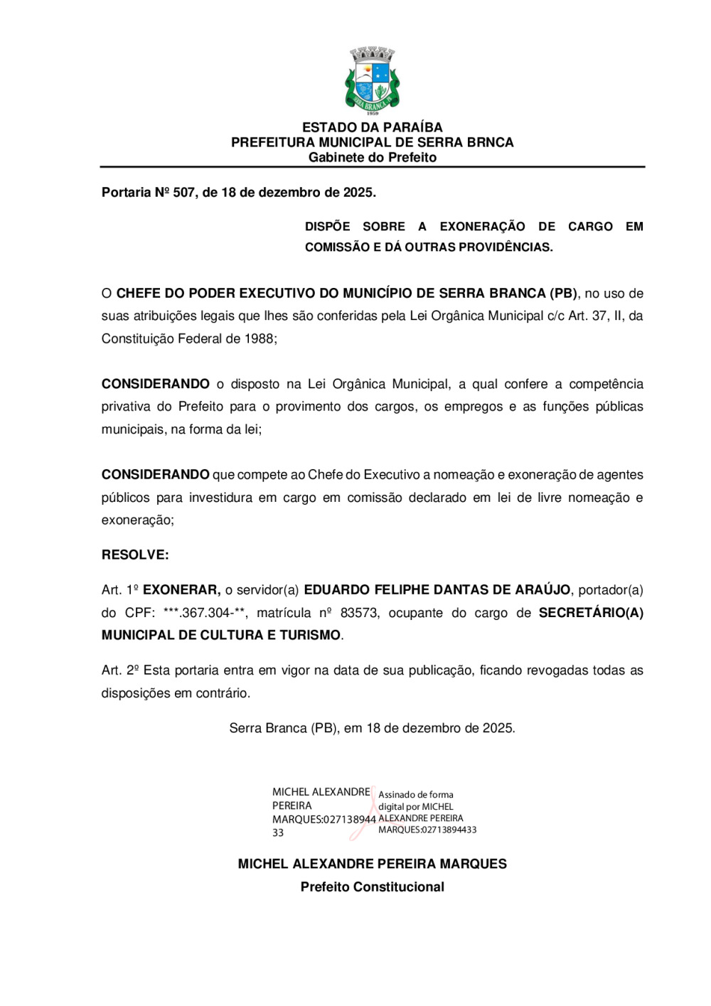 PORTARIA N° 0507/2025 - EXONERAÇÃO DE EDUARDO FELIPHE DANTAS DE ARAÚJO