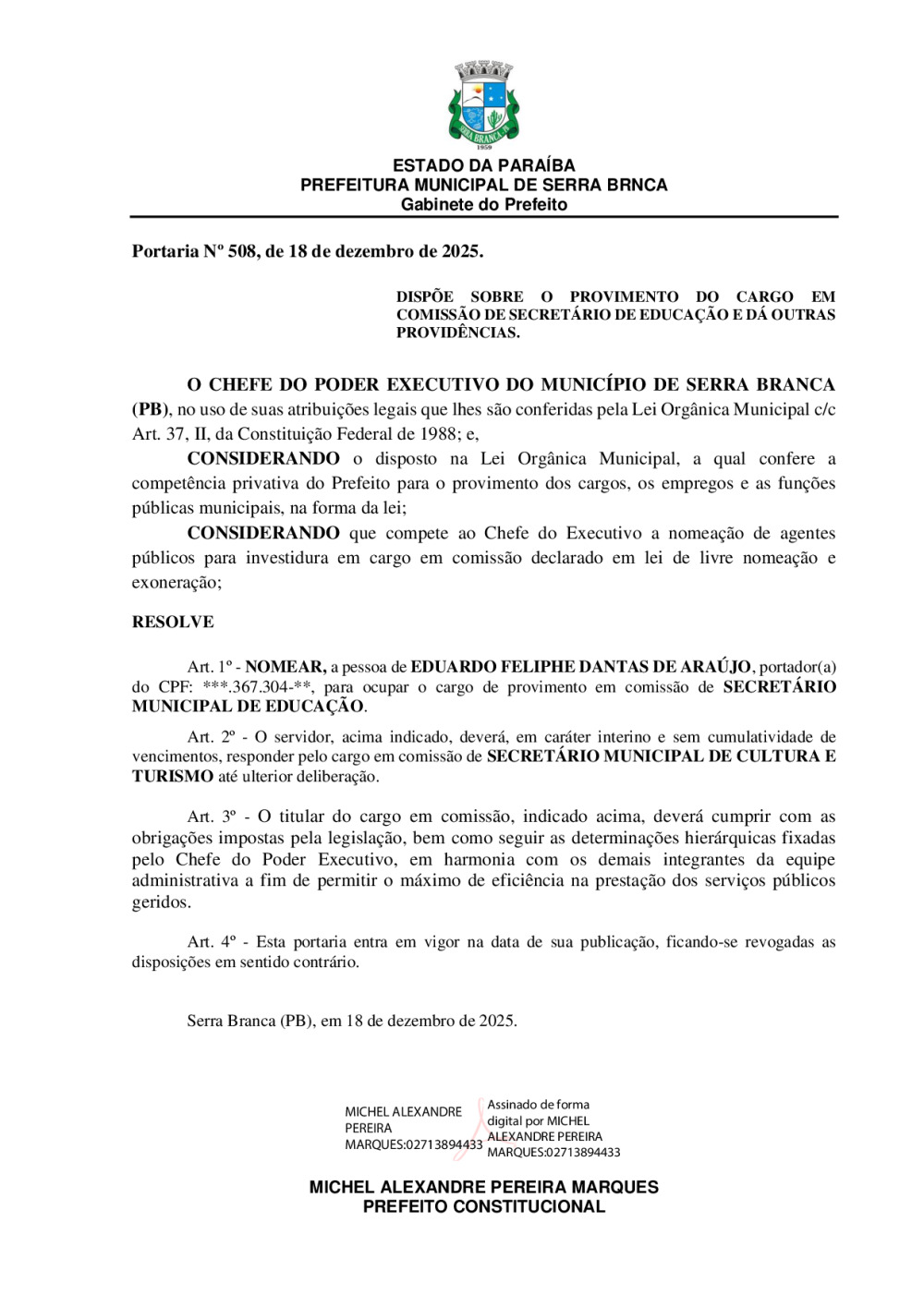 PORTARIA N° 0508/2025 - NOMEAÇÃO DE EDUARDO FELIPHE DANTAS DE ARAÚJO