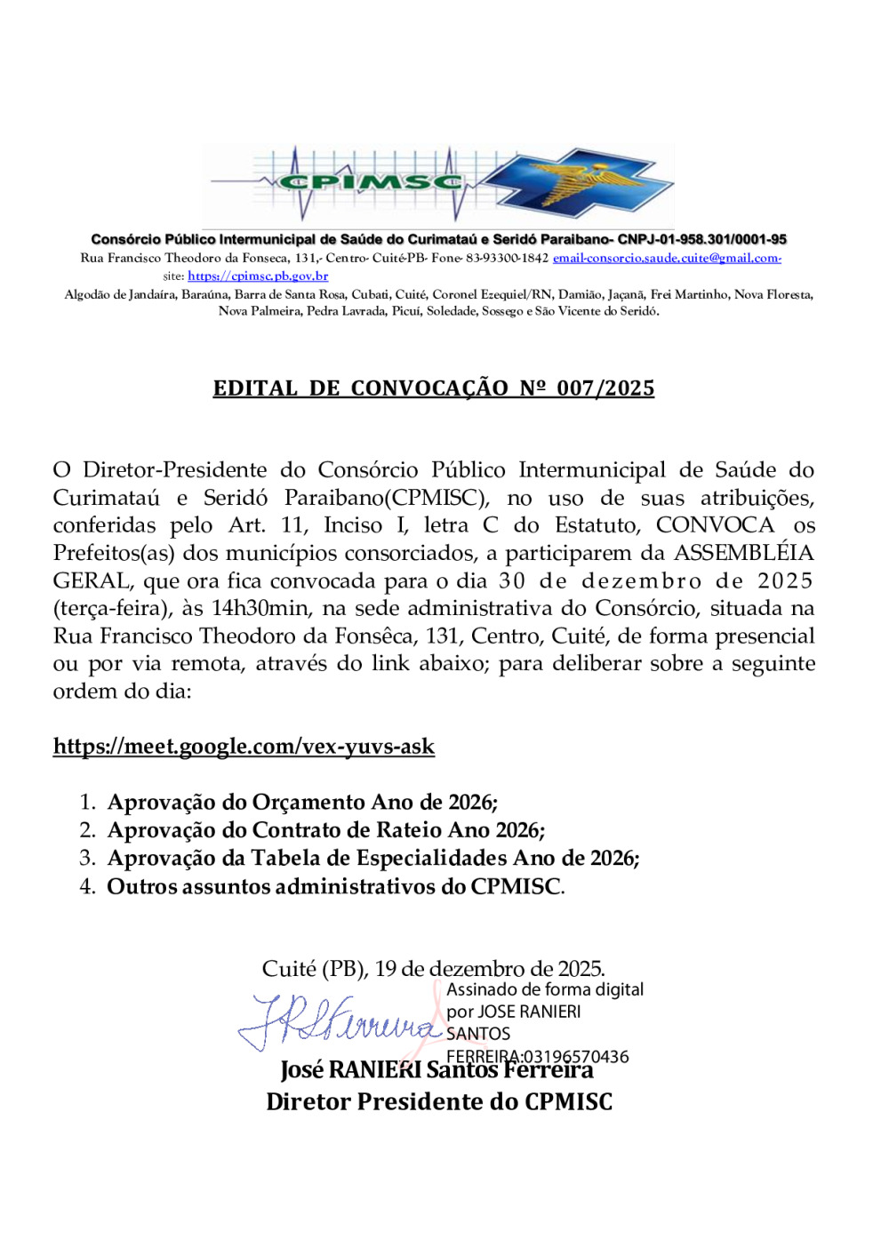 EDITAL DE CONVOCAÇÃO N° 0007/2025