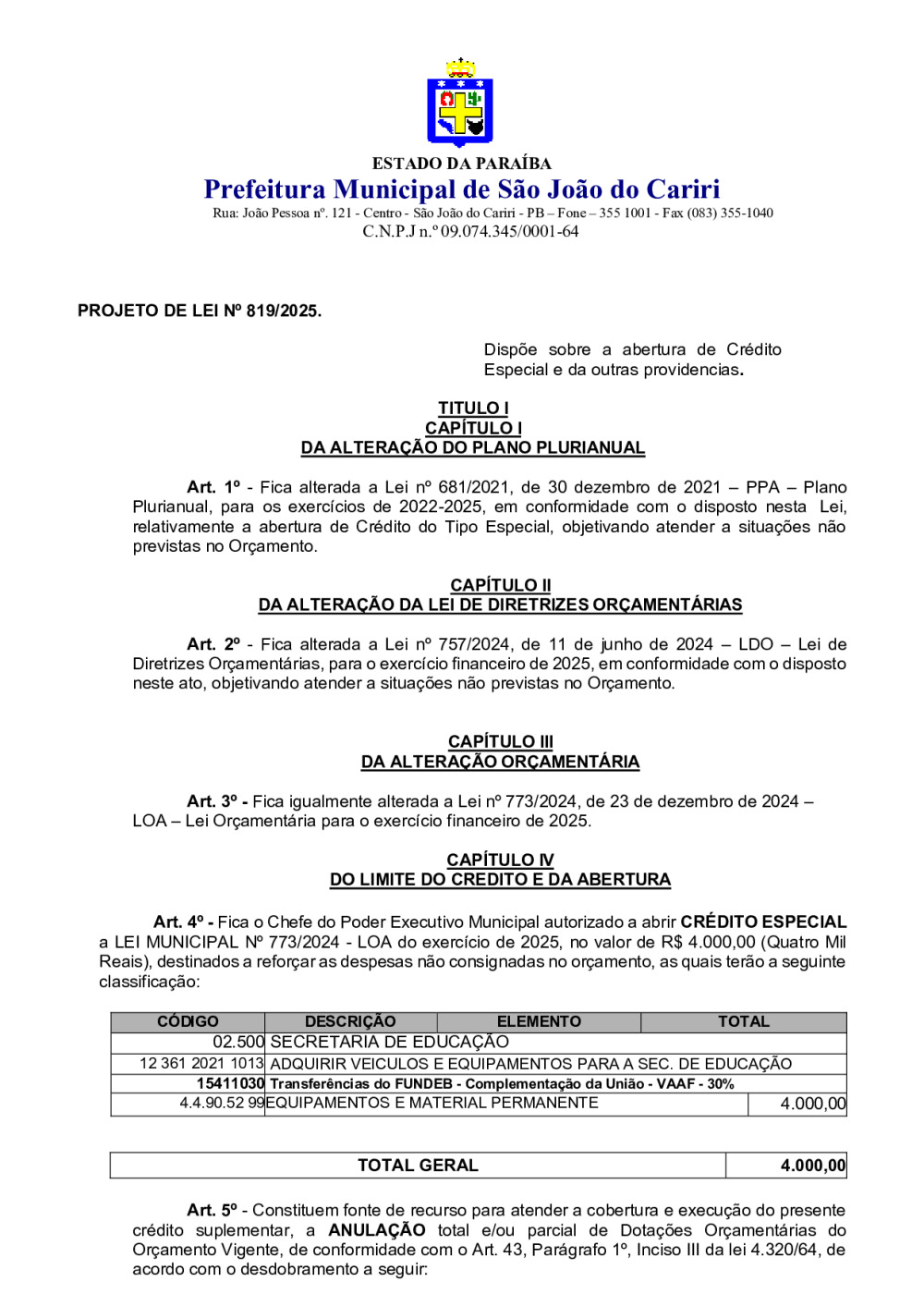 LEI 819/2025 - DISPÕE SOBRE A ABERTURA DE CRÉDITO ESPECIAL E DA OUTRAS PROVIDENCIAS.
