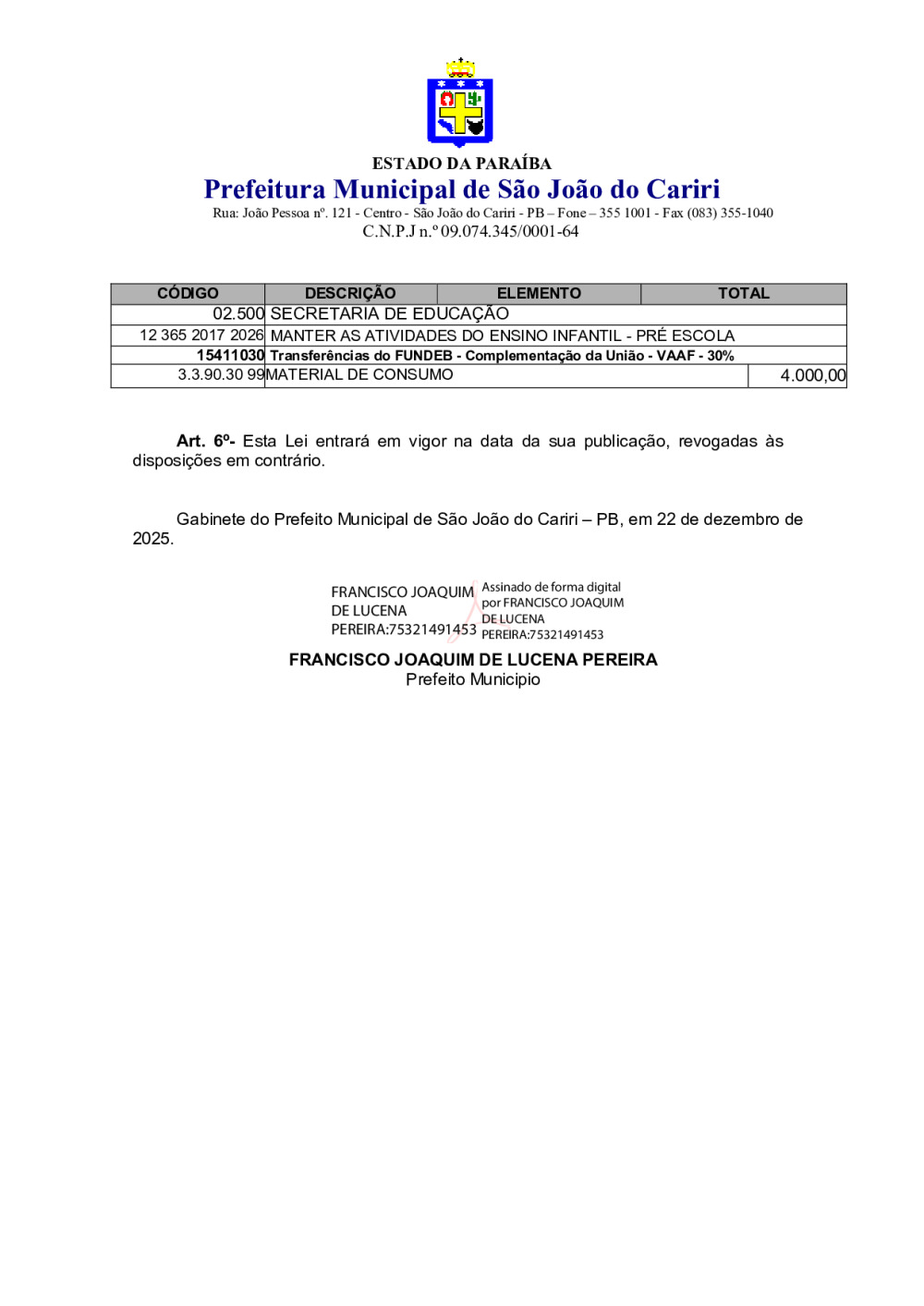 Conforme MP n° 2.200-2 de 24/08/2001, que institui a infraestrutura de chaves Públicas. Matéria Publicada no Diário Oficial do Município de São João do Cariri/PB no dia - Edição 01885.