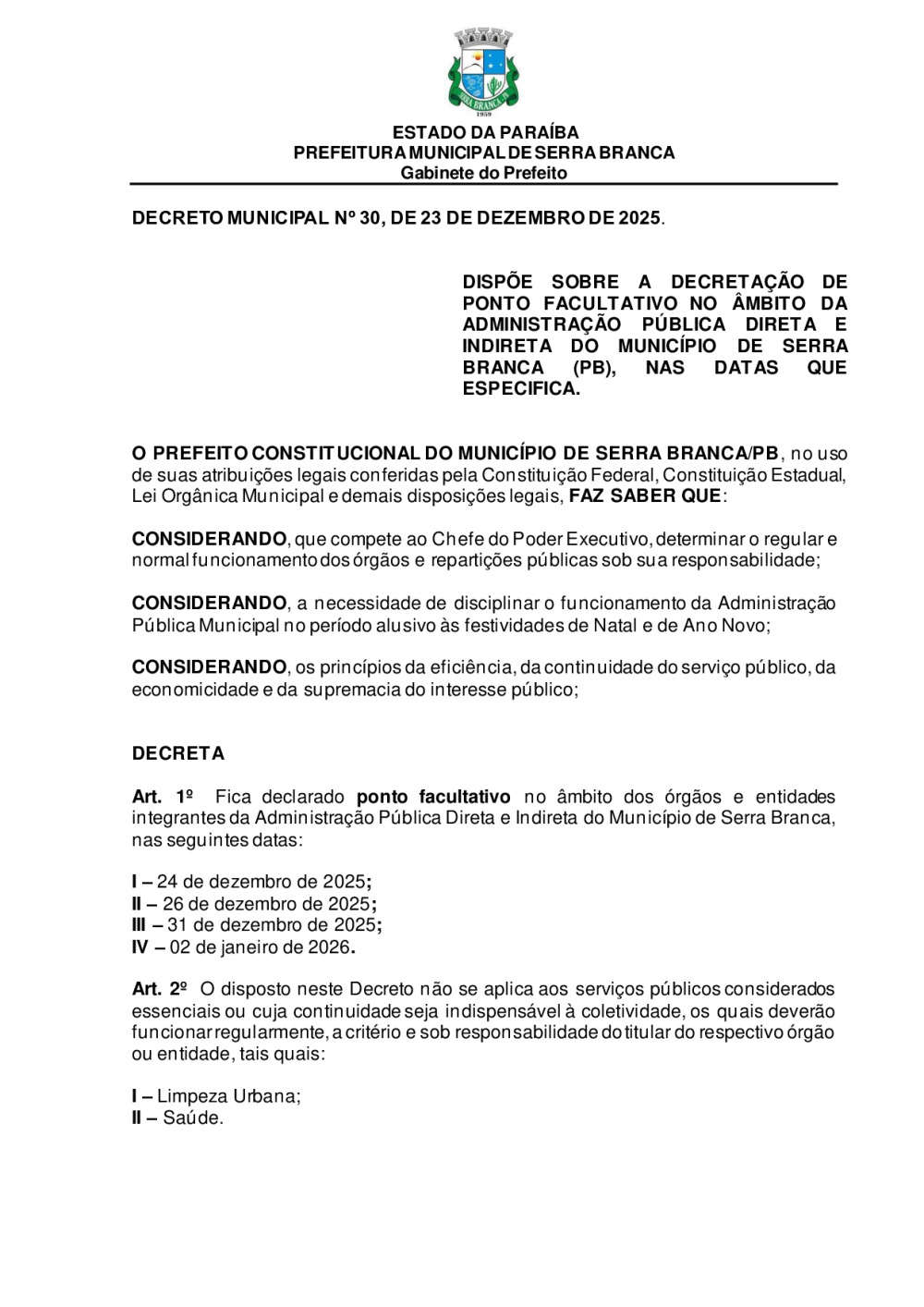 DECRETO N° 0030/2025 - DISPÕE SOBRE A DECRETAÇÃO DE PONTO FACULTATIVO NO ÂMBITO DA ADMINISTRAÇÃO PÚBLICA DIRETA E INDIRETA DO MUNICÍPIO