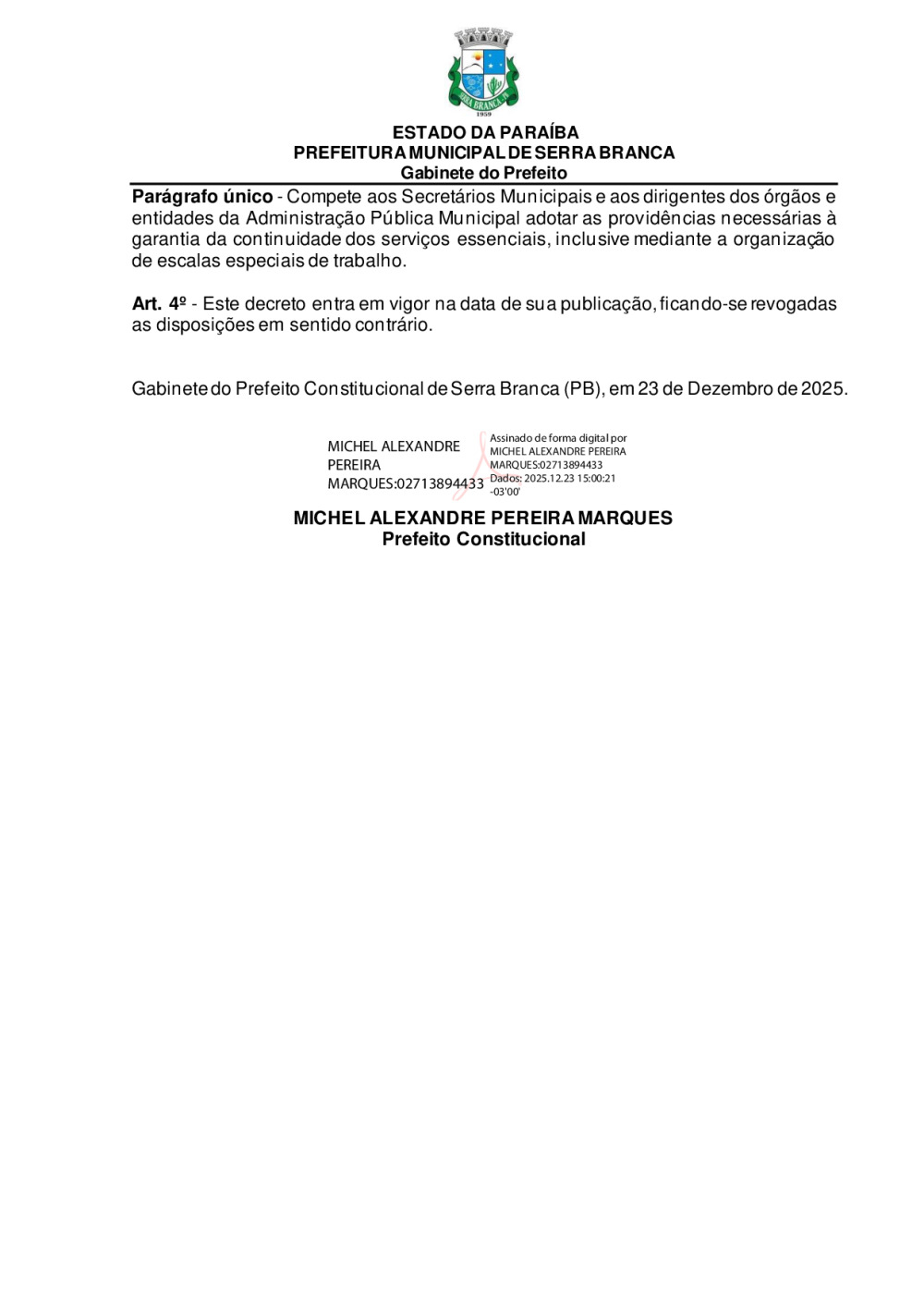 Conforme MP n° 2.200-2 de 24/08/2001, que institui a infraestrutura de chaves Públicas. Matéria Publicada no Diário Oficial do Município de Serra Branca/PB no dia - Edição 00244.