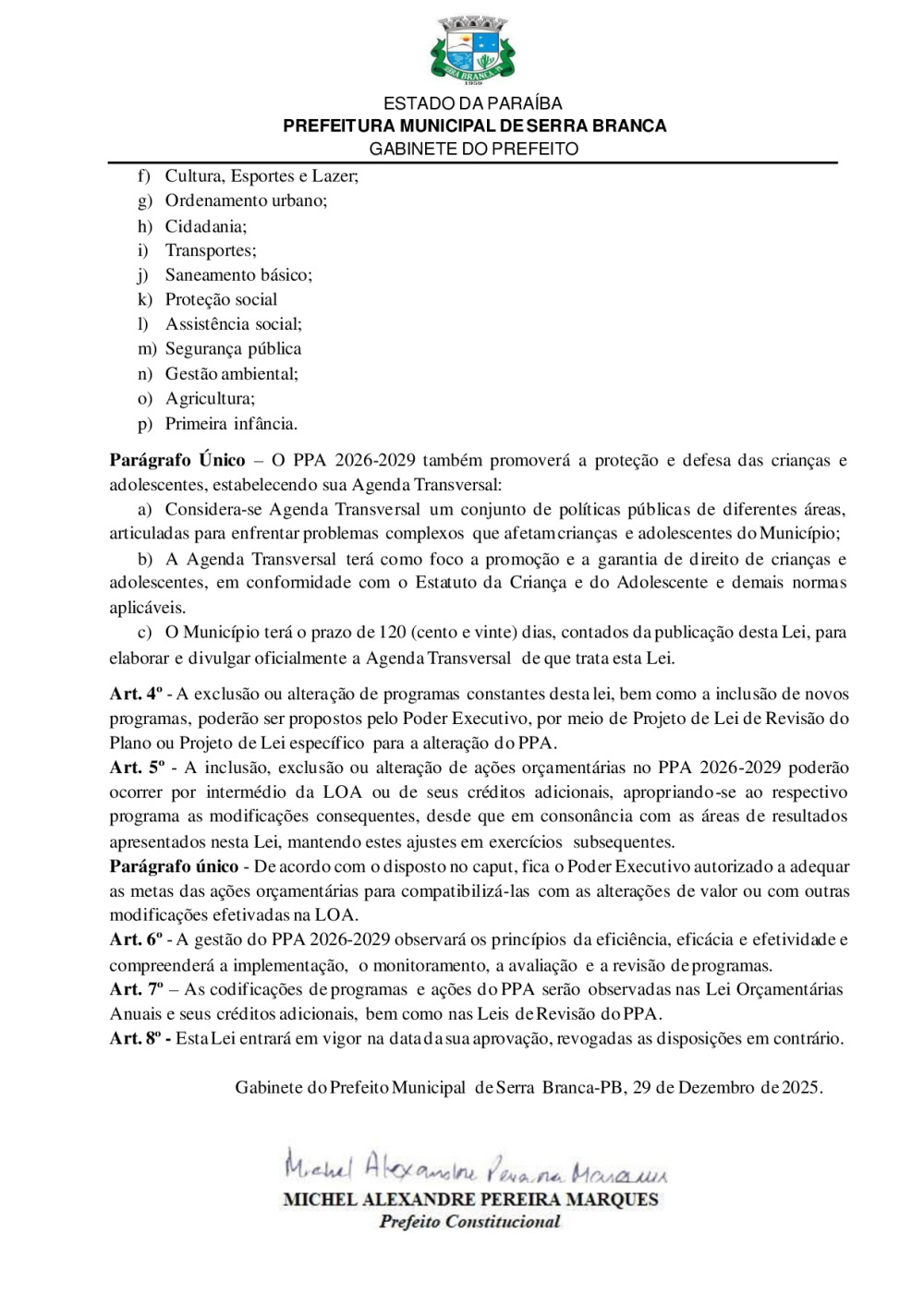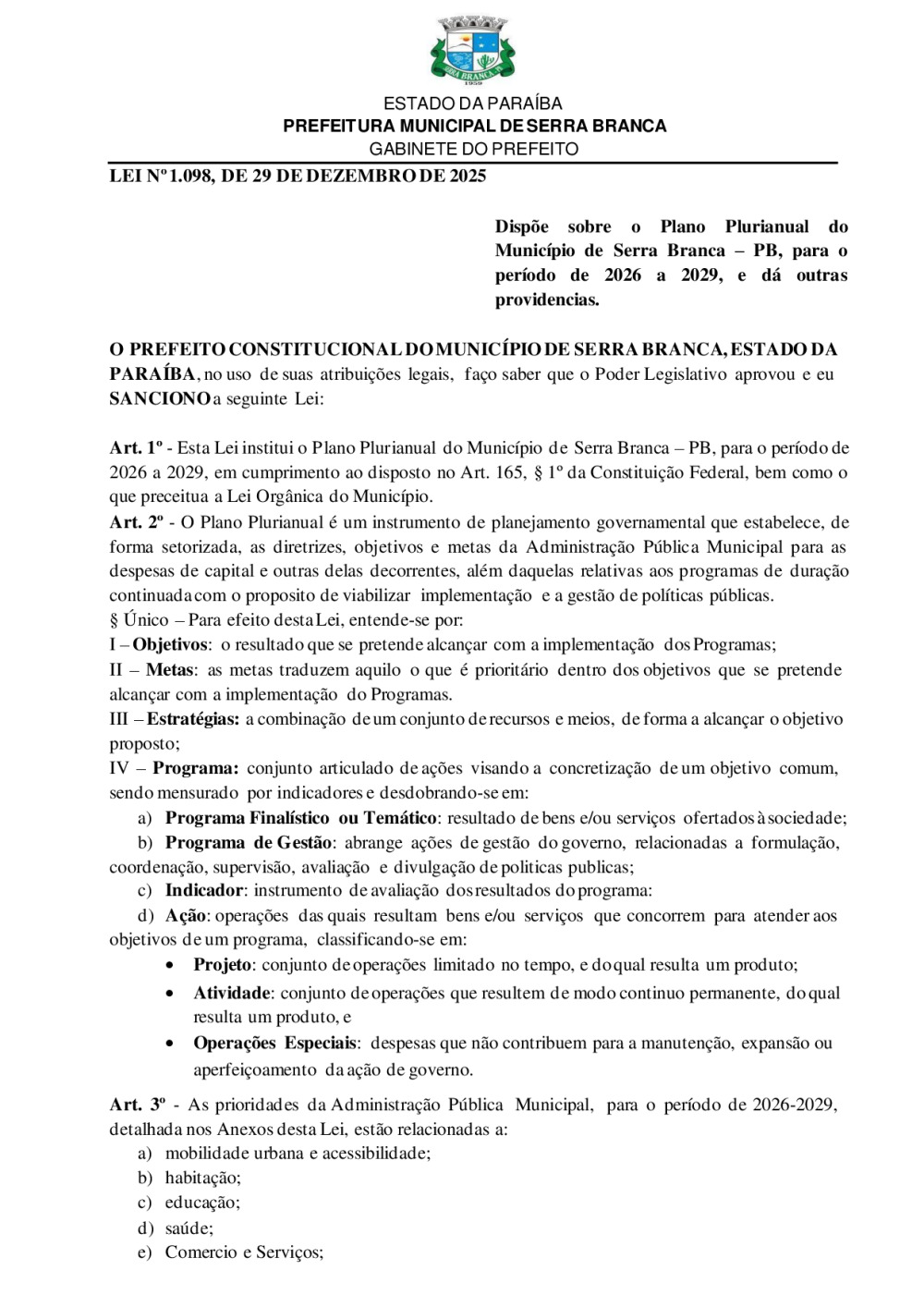 LEI N° 1098/2025 - DISPÕE SOBRE O PLANO PLURIANUAL DO MUNICÍPIO DE SERRA BRANCA – PB, PARA O PERÍODO DE 2026 A 2029