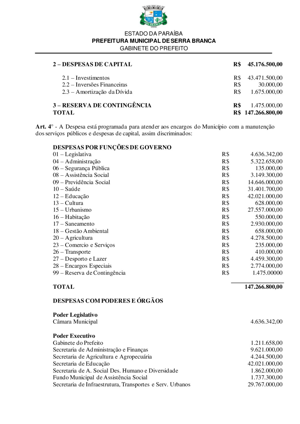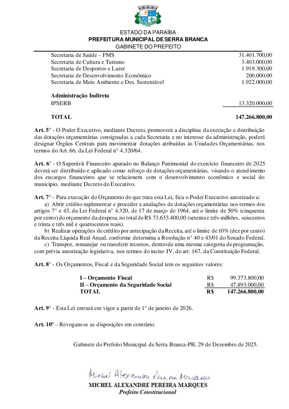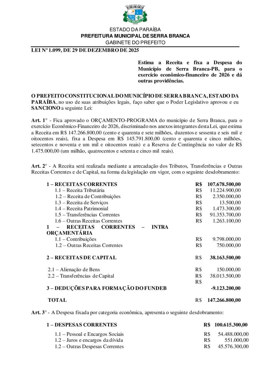LEI N° 1099/ 2025 - ESTIMA A RECEITA E FIXA A DESPESA DO MUNICÍPIO DE SERRA BRANCA-PB, PARA O EXERCÍCIO ECONÔMICO-FINANCEIRO DE 2026