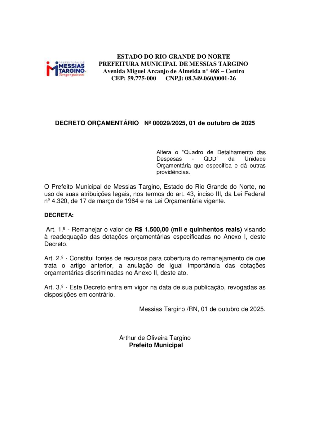 DECRETO ORÇAMENTÁRIO Nº 00029/2025