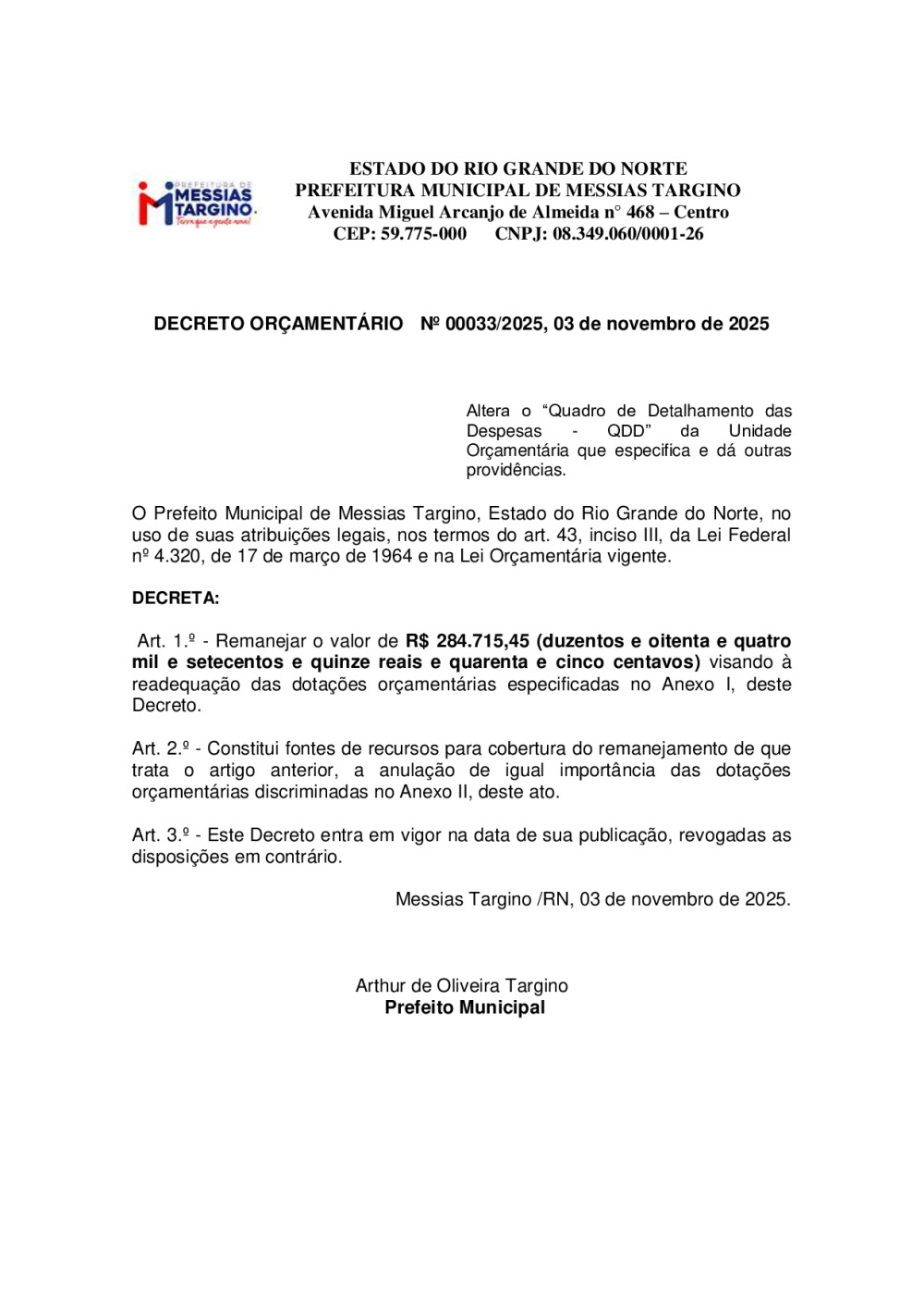 DECRETO ORÇAMENTÁRIO Nº 00033/2025