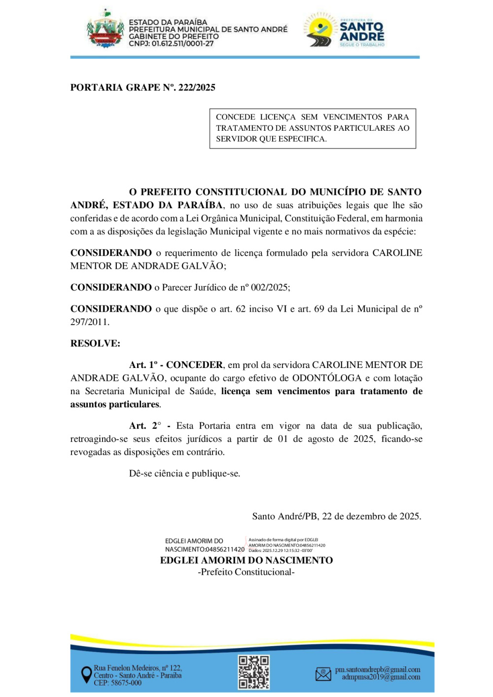PORTARIA GRAPE Nº. 222/2025 - CONCEDE LICENÇA SEM VENCIMENTOS PARA TRATAMENTO DE ASSUNTOS PARTICULARES AO SERVIDOR QUE ESPECIFICA.