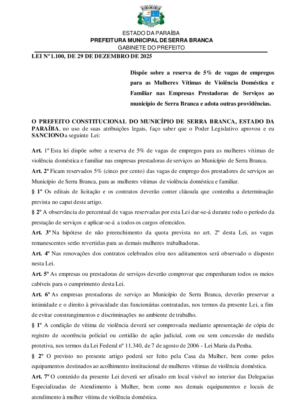 LEI N° 1100/2025 - DISPÕE SOBRE A RESERVA DE 5% DE VAGAS DE EMPREGOS PARA AS MULHERES VÍTIMAS DE VIOLÊNCIA DOMÉSTICA E FAMILIAR NAS EMPRESAS PRESTADORAS DE SERVIÇOS AO MUNICÍPIO DE SERRA BRANCA