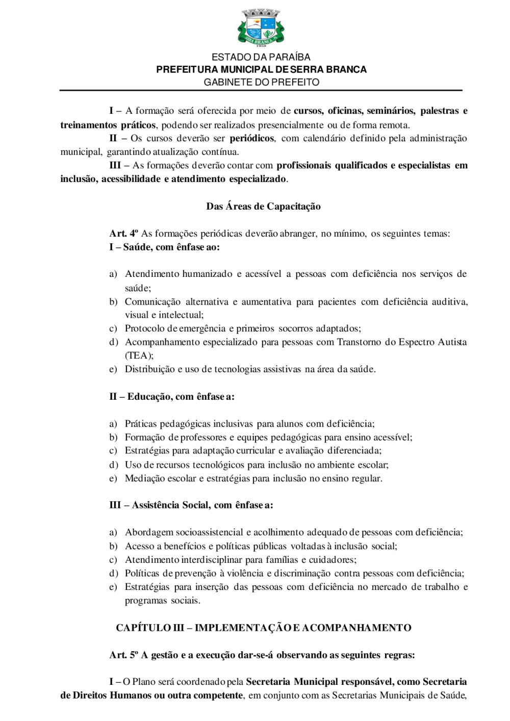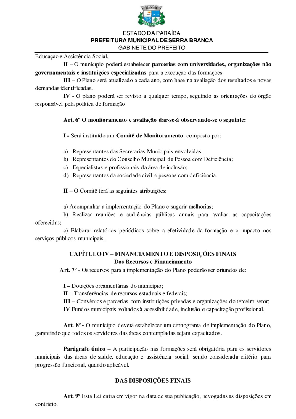 LEI N° 1111/2025 - DISPÕE SOBRE A CRIAÇÃO DO PLANO MUNICIPAL DE FORMAÇÃO PERIÓDICA DOS SERVIDORES DA SAÚDE, EDUCAÇÃO E ASSISTÊNCIA SOCIAL NO ATENDIMENTO ÀS PESSOAS COM DEFICIÊNCIA-PCD NO MUNICÍPIO DE SERRA BRANCA