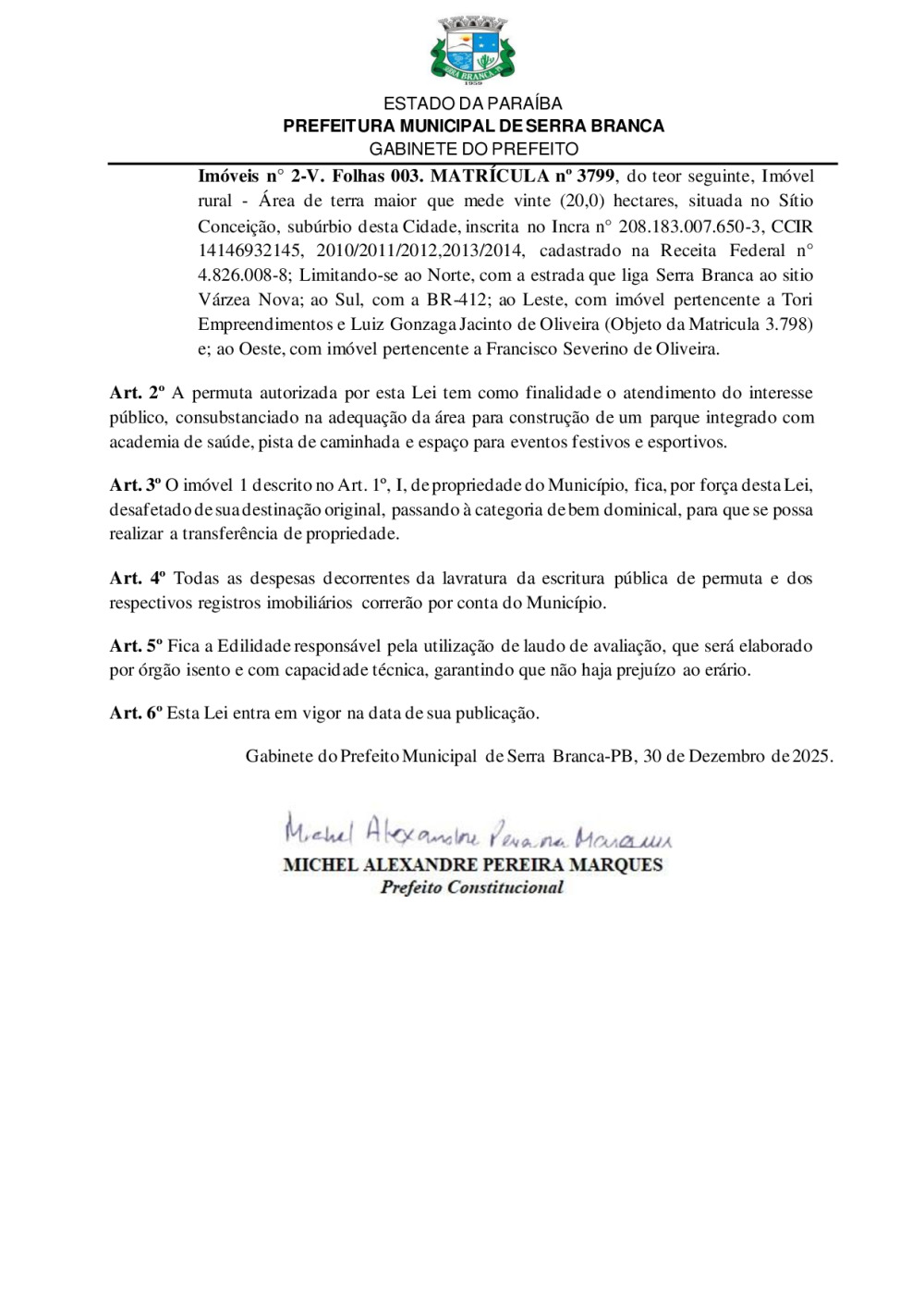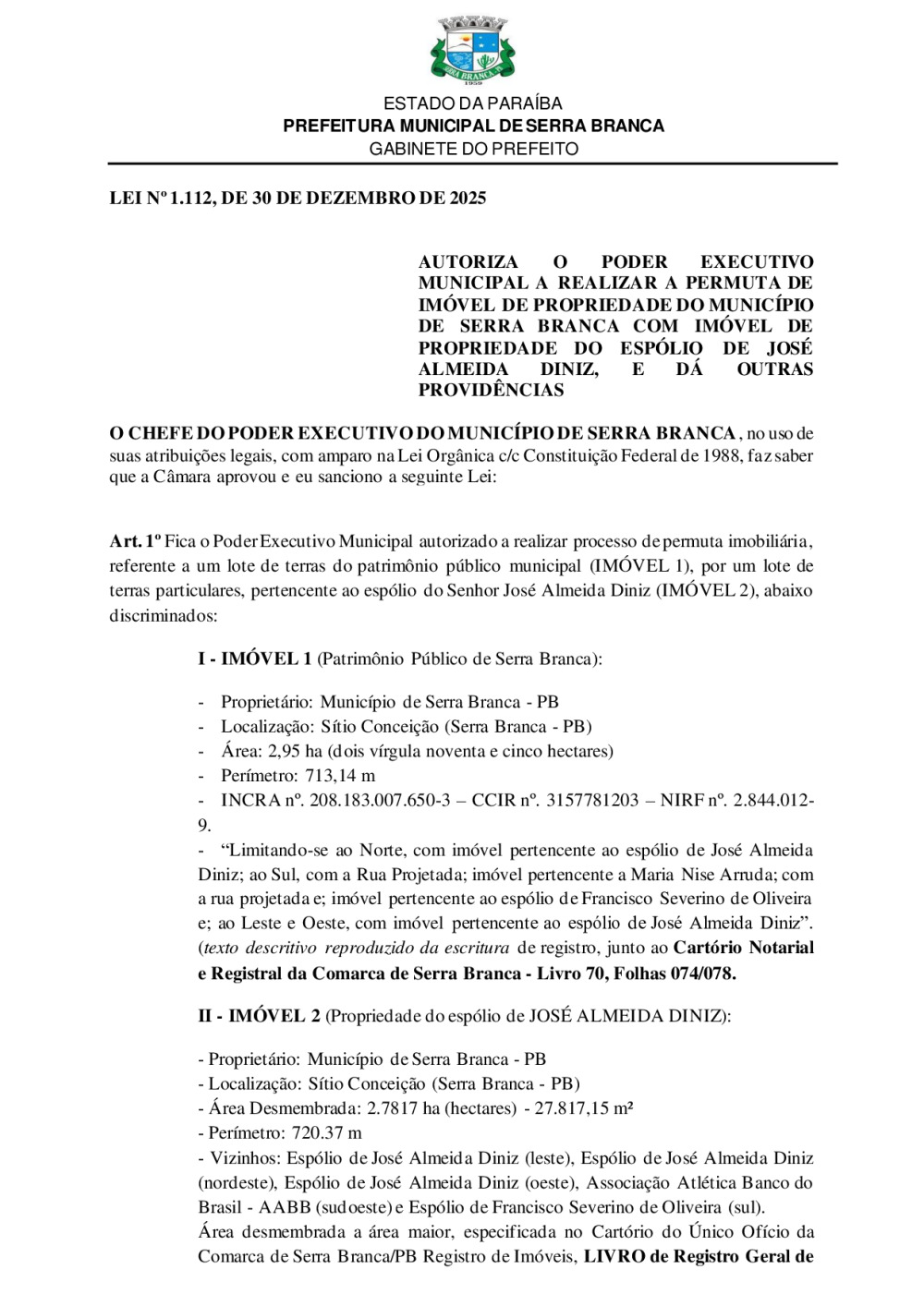 LEI N° 1112/2025 - AUTORIZA O PODER EXECUTIVO MUNICIPAL A REALIZAR A PERMUTA DE IMÓVEL DE PROPRIEDADE DO MUNICÍPIO DE SERRA BRANCA COM IMÓVEL DE PROPRIEDADE DO ESPÓLIO DE JOSÉ ALMEIDA DINIZ