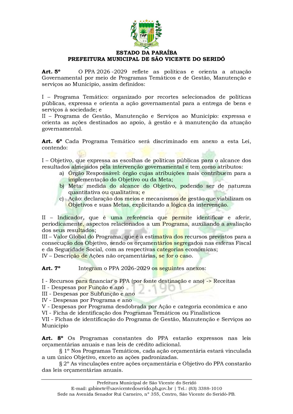 LEI MUNICIPAL Nº 287, DE 30 DE DEZEMBRO DE 2025. DISPÕE SOBRE O PLANO PLURIANUAL DO MUNICÍPIO DE SÃO VICENTE DO SERIDÓ PARA O PERÍODO 2026/2029