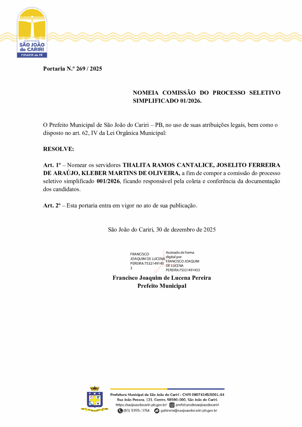 PORTARIA 269/2025 - NOMEIA COMISSÃO DO PROCESSO SELETIVO SIMPLIFICADO 01/2026.