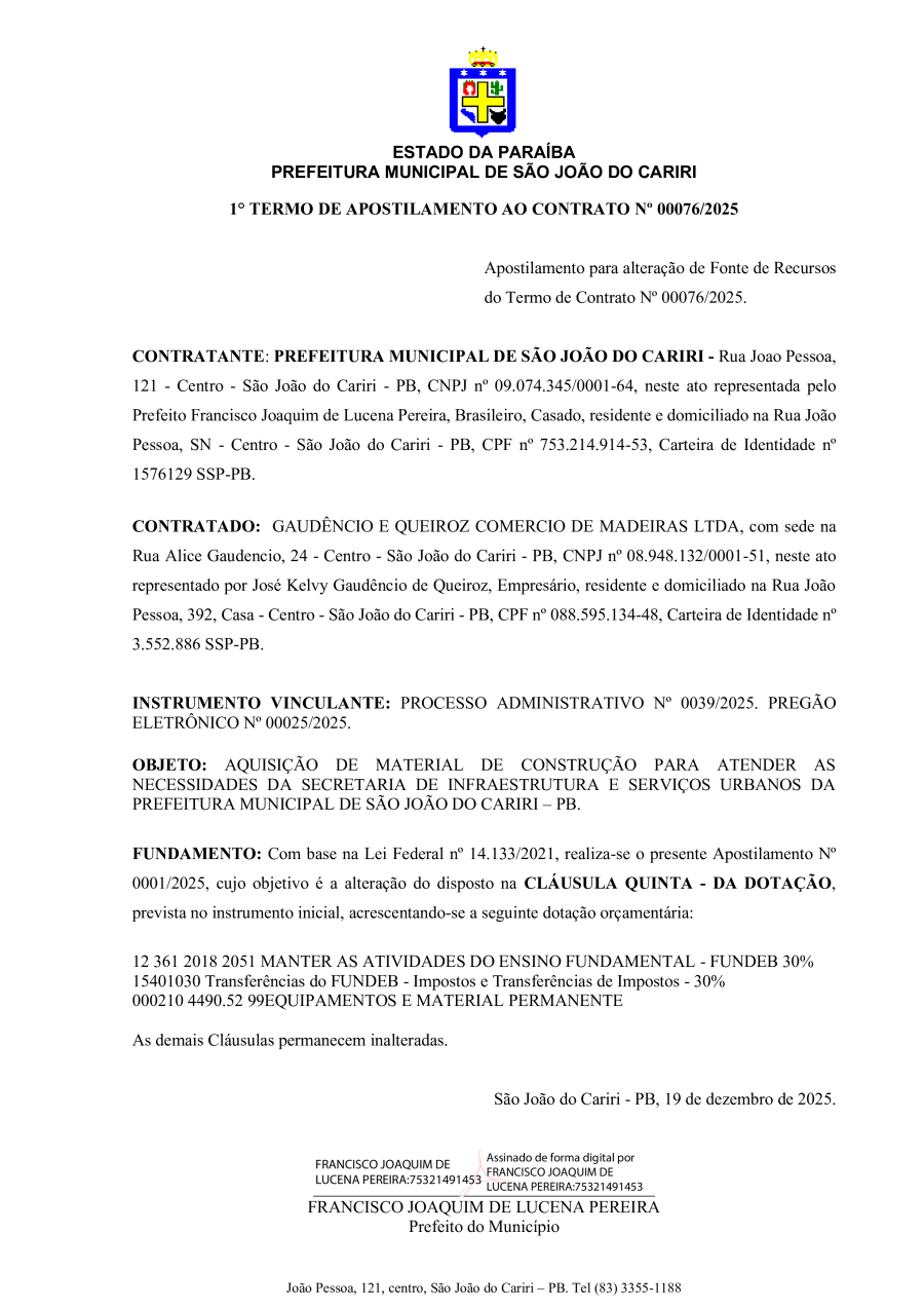 1° TERMO DE APOSTILAMENTO AO CONTRATO Nº 00076/2025