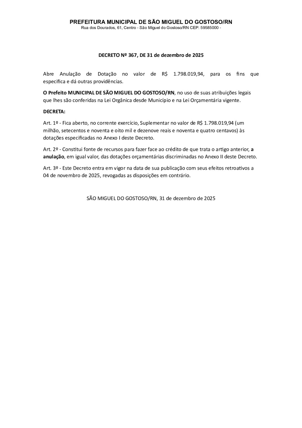 RETIFICAÇÃO - DECRETO ANULAÇÃO DE DOTAÇÃO 367