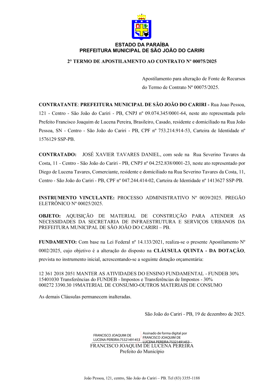 2° TERMO DE APOSTILAMENTO AO CONTRATO Nº 00075/2025