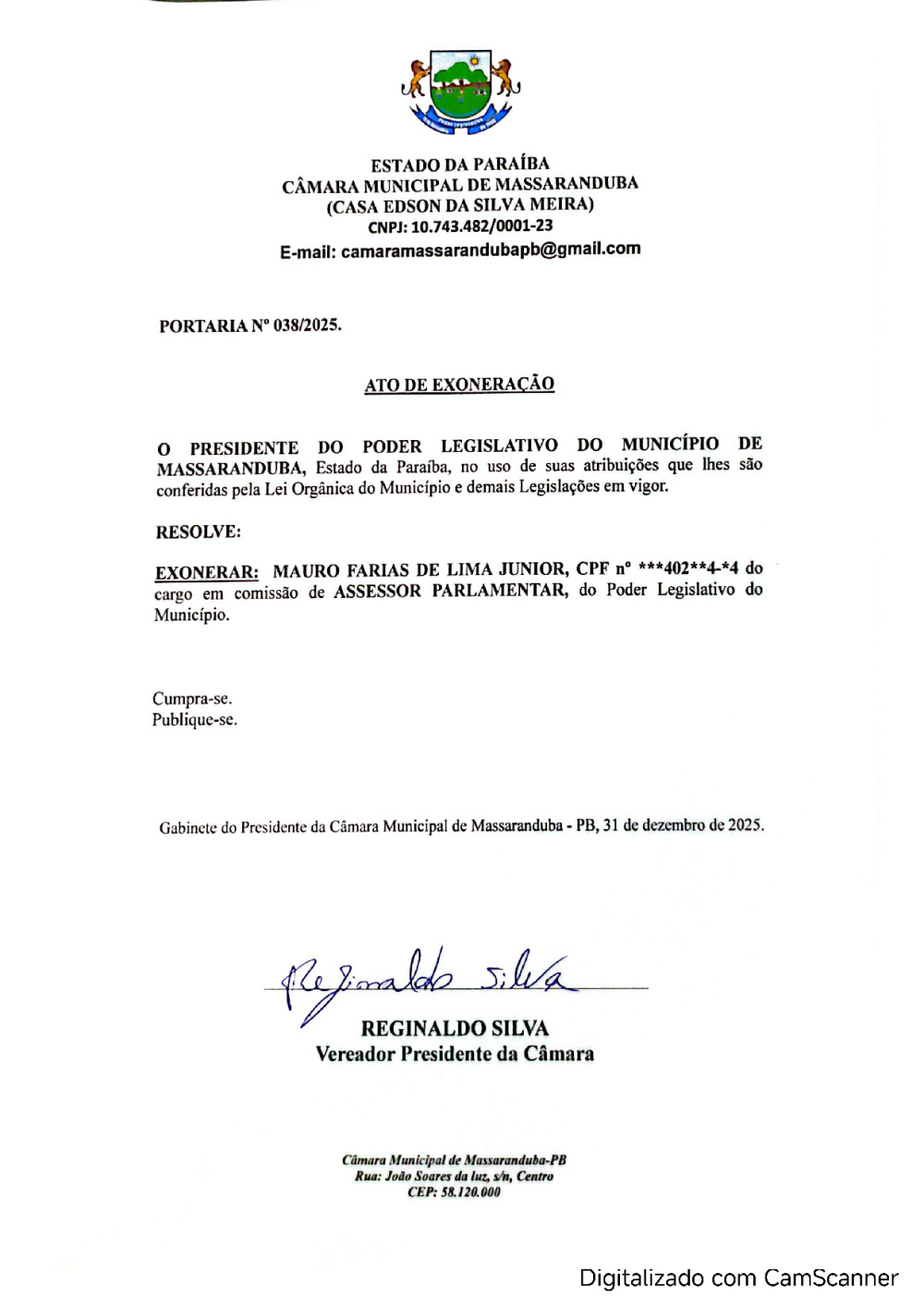 PORTARIA N° 0038/2025 - EXONERAÇÃO DE MAURO FARIAS DE LIMA JUNIOR