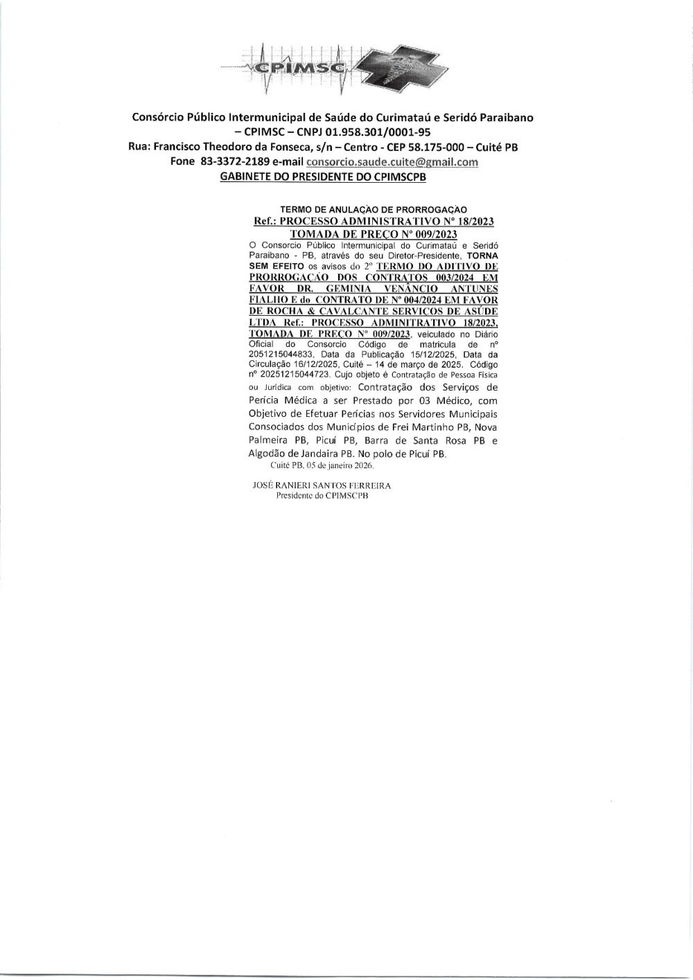 Conforme MP n° 2.200-2 de 24/08/2001, que institui a infraestrutura de chaves Públicas. Matéria Publicada no Diário Oficial do Consórcio Intermunicipal de Saúde do Curimataú e Seridó Paraibano/PB no dia - Edição 01382.