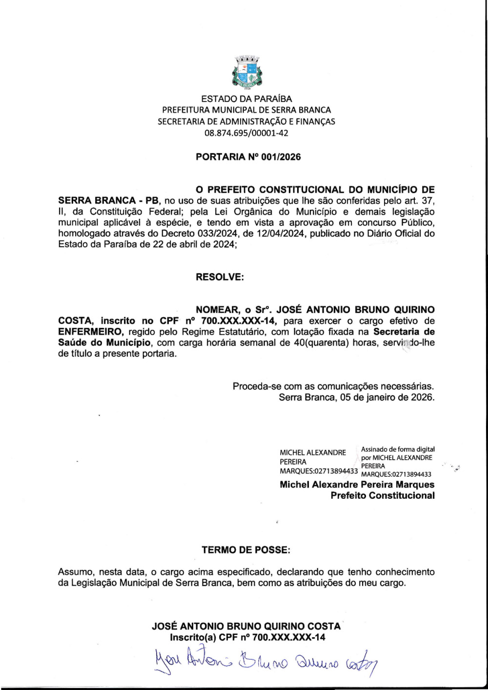 PORTARIA N° 0001/2026 - NOMEAÇÃO DE JOSÉ ANTONIO BRUNO QUIRINO COSTA