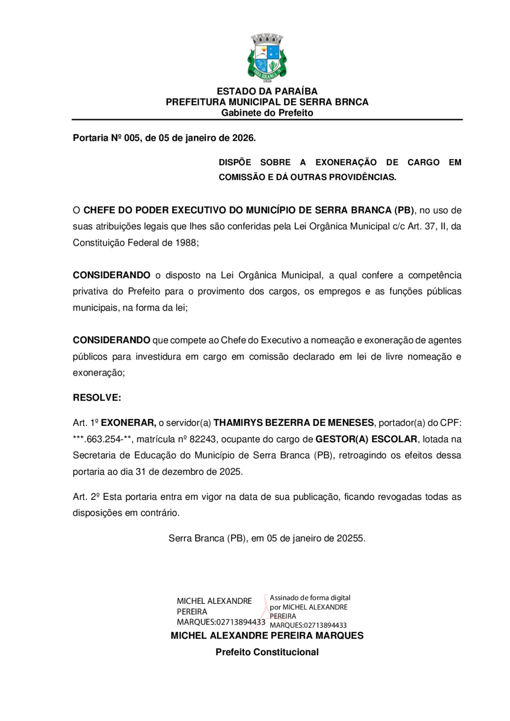 PORTARIA N° 0005/2026 - EXONERAÇÃO DE THAMIRYS BEZERRA DE MENESES