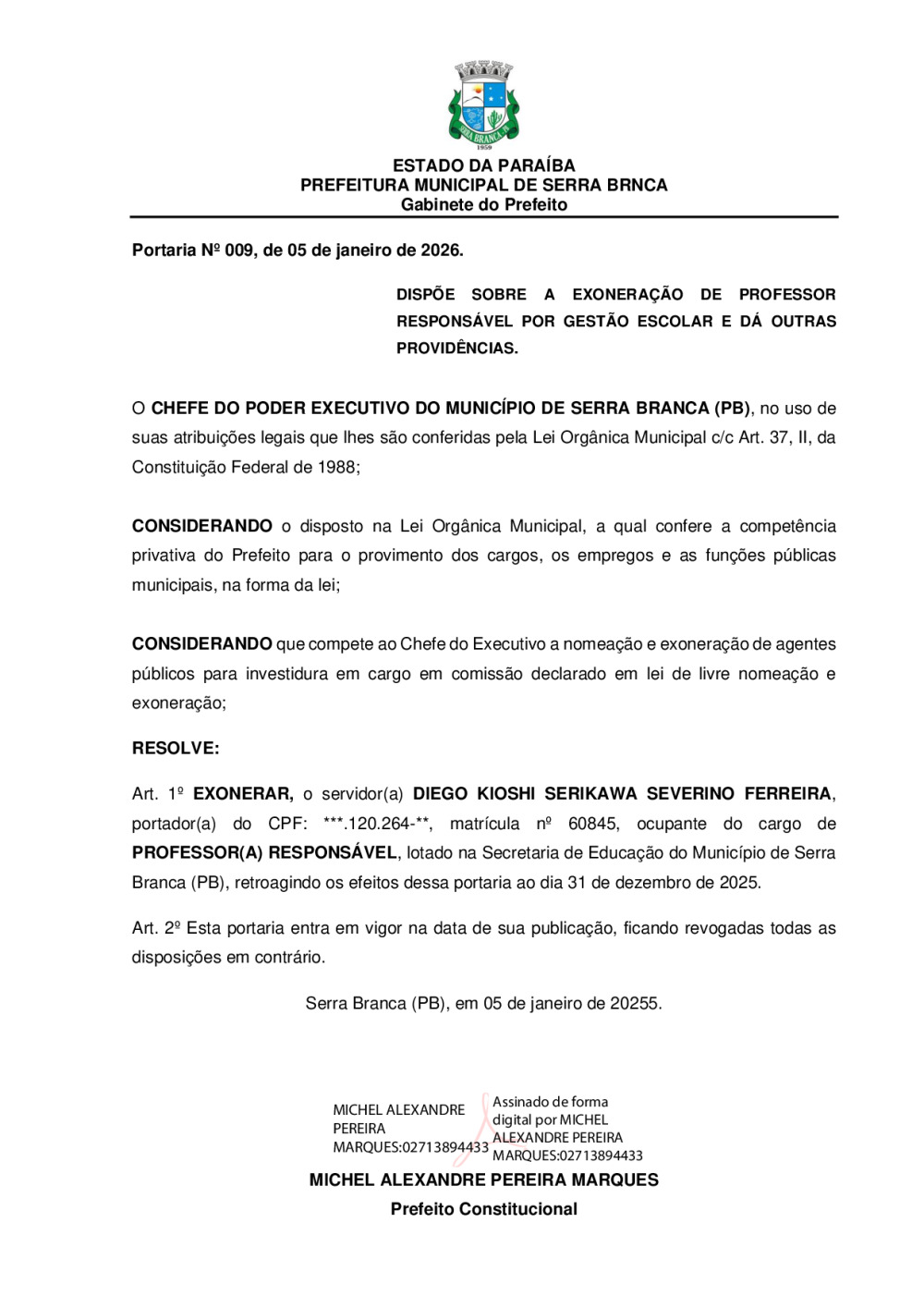 PORTARIA N° 0009/2026 - EXONERAÇÃO DE DIEGO KIOSHI SERIKAWA SEVERINO FERREIRA