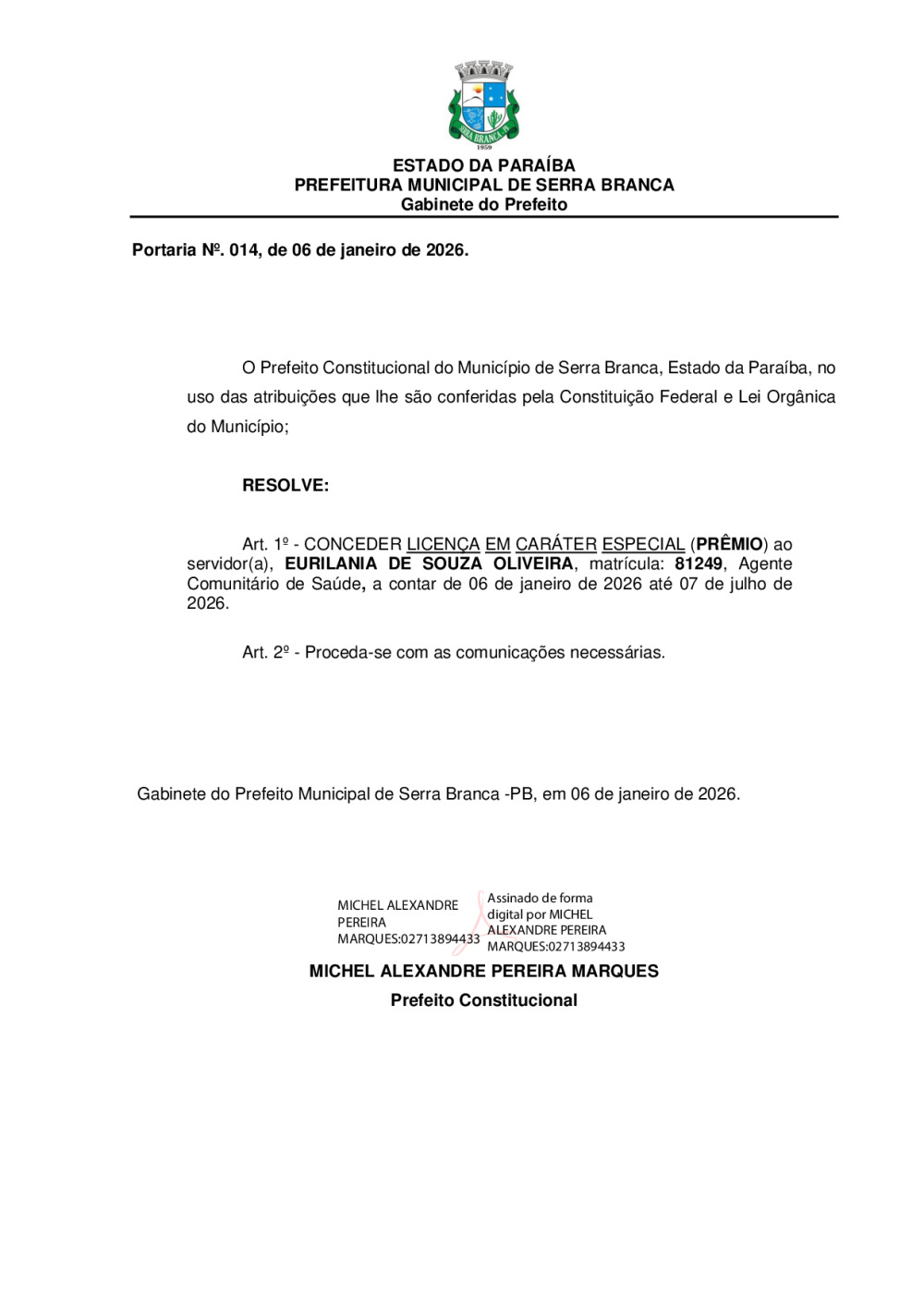 PORTARIA N° 0014/2026 - CONCEDER LICENÇA EM CARÁTER ESPECIAL A SERVIDORA, EURILANIA DE SOUZA OLIVEIRA