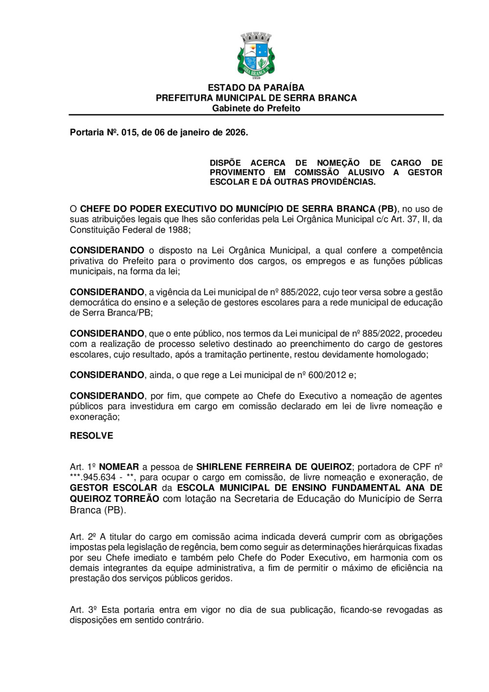 PORTARIA N° 0015/2026 - NOMEAÇÃO DE SHIRLENE FERREIRA DE QUEIROZ