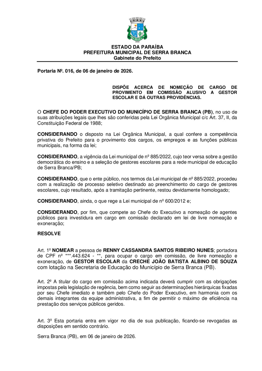 PORTARIA N° 0016/2026 - NOMEAÇÃO DE RENNY CASSANDRA SANTOS RIBEIRO NUNES
