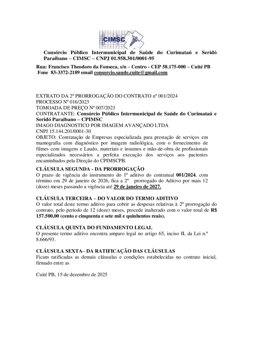 EXTRATO DA 2º PRORROGAÇÃO DO CONTRATO N° 0001/2024 - PROCESSO N° 0016/2023 - TOMOADA DE PREÇO N° 0007/2023