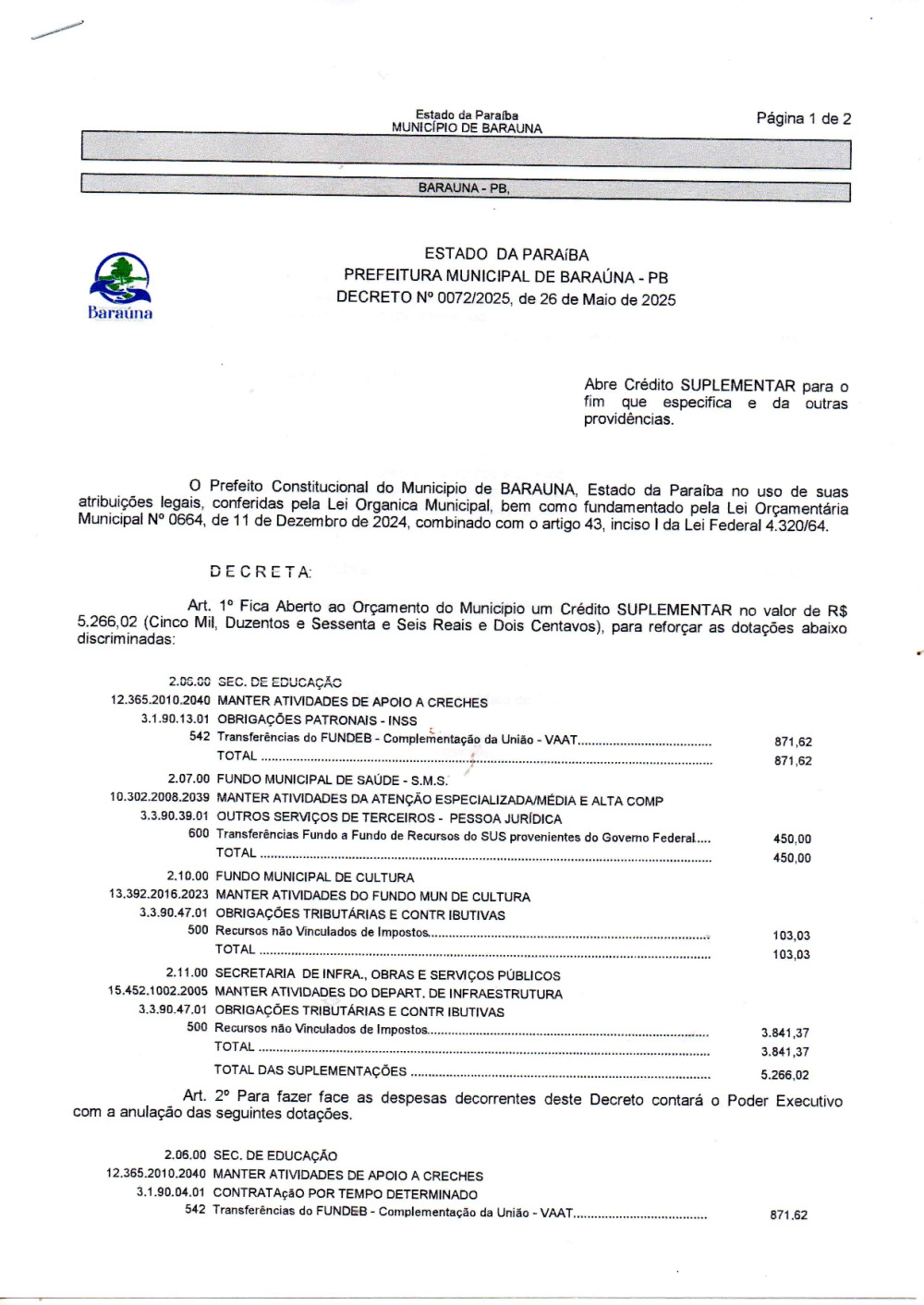 DECRETO Nº 072/2025 ABRE CREDITO SUPLEMENTAR. - 07 DE JANEIRO DE 2026.