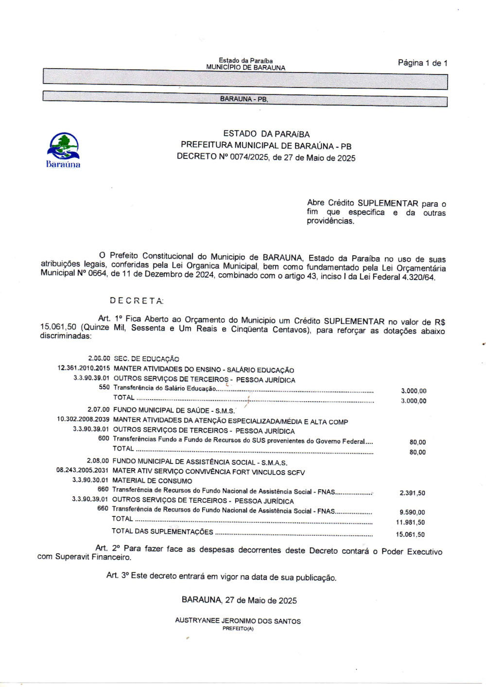 Conforme MP n° 2.200-2 de 24/08/2001, que institui a infraestrutura de chaves Públicas. Matéria Publicada no Diário Oficial do Município de Baraúna/PB no dia - Edição 01398.