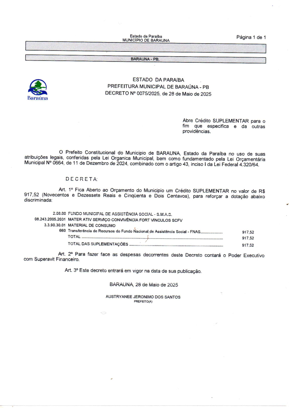 Conforme MP n° 2.200-2 de 24/08/2001, que institui a infraestrutura de chaves Públicas. Matéria Publicada no Diário Oficial do Município de Baraúna/PB no dia - Edição 01398.