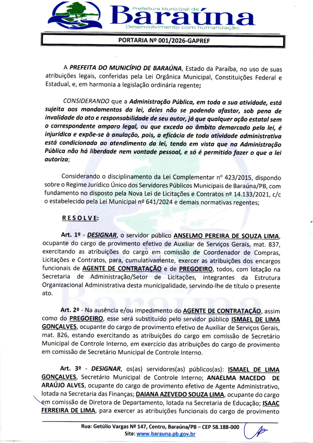 PORTARIA Nº 001/2026-GAPREF - DESIGNAR O SERVIDOR PÚBLICO ANSELMO PEREIRA DE SOUZA LIMA, PARA EXERCER AS ATRIBUIÇÕES DO CARGO EM COMISSÃO DE COORDENADOR DE COMPRAS, LICITAÇÕES E CONTRATOS. - 07 DE JANEIRO DE 2026.