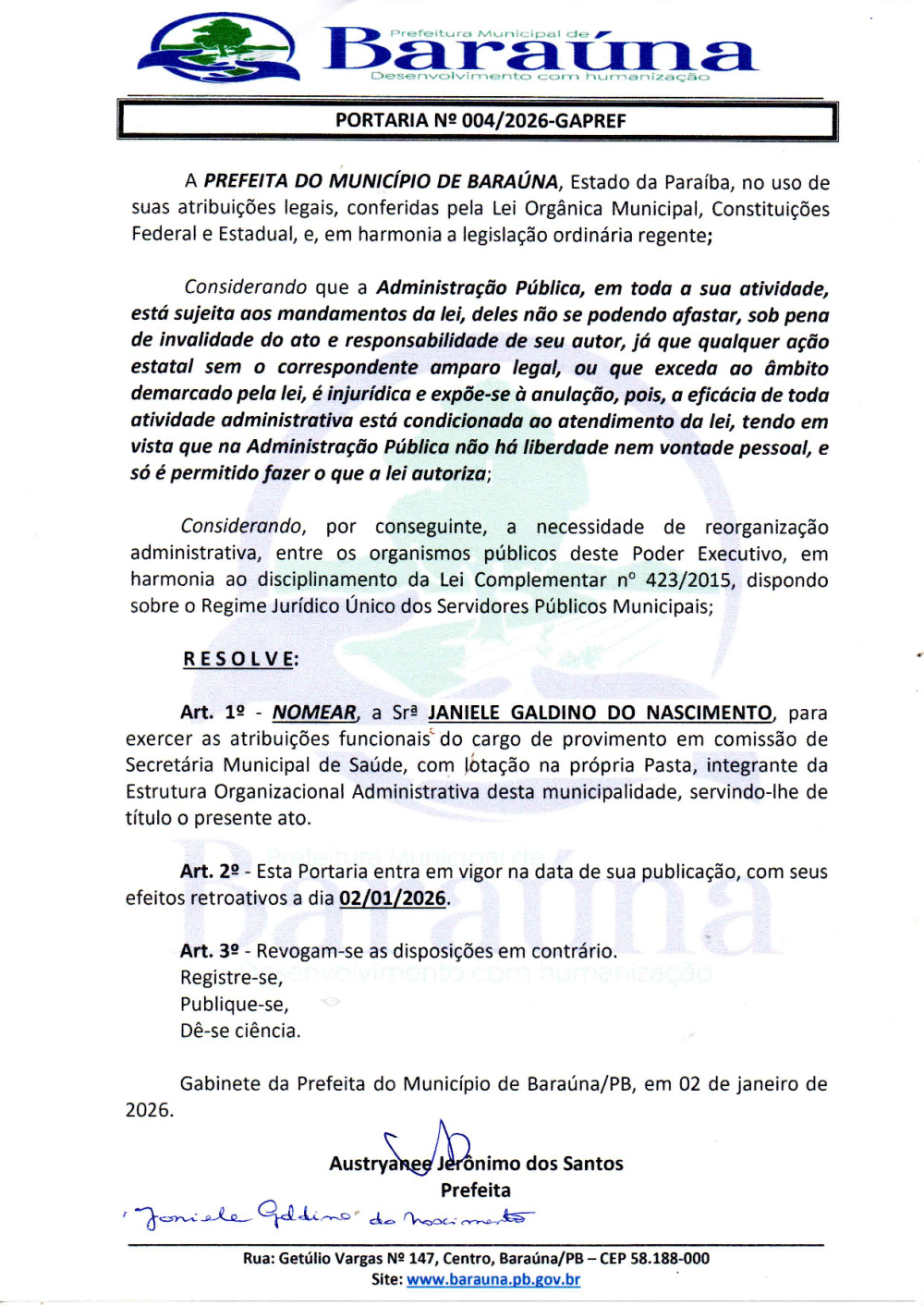 PORTARIA Nº 004/2026-GAPREF - NOMEAR A SRª JANIELE GALDINO DO NASCIMENTO, PARA EXERCER AS ATRIBUIÇÕES FUNCIONAIS DO CARGO DE PROVIMENTO EM COMISSÃO DE SECRETÁRIA DE SAÚDE. - 07 DE JANEIRO DE 2026.