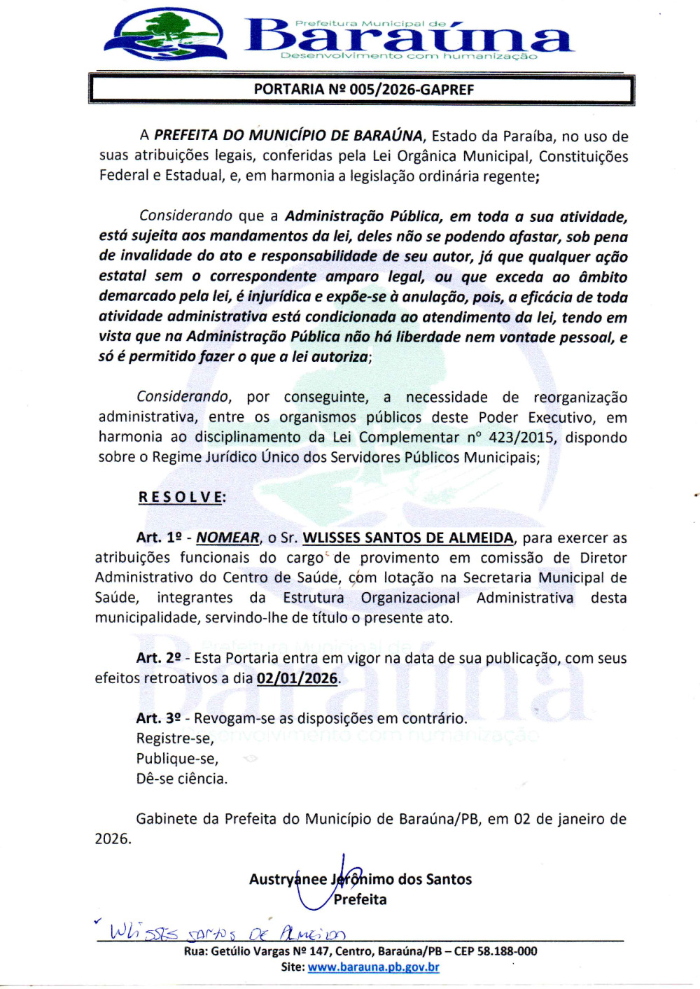 PORTARIA Nº 005/2026-GAPREF - NOMEAR O SRº WLISSES SANTOS DE ALMEIDA, PARA EXERCER AS ATRIBUIÇÕES FUNCIONAIS DO CARGO DE PROVIMENTO EM COMISSÃO DE DIRETOR ADMINISTRATIVO DO CENTRO DE SAÚDE. - 07 DE JANEIRO DE 2026.